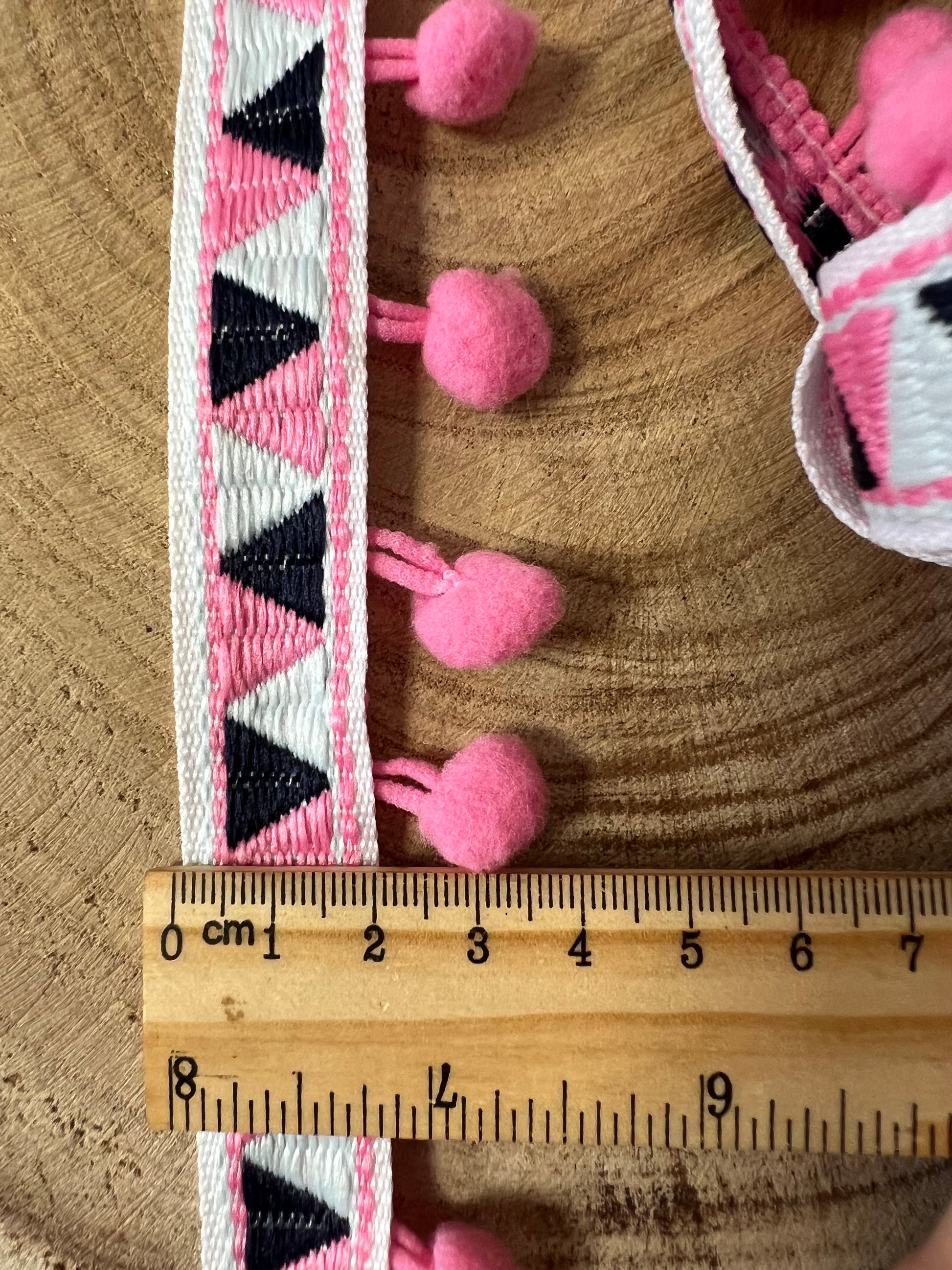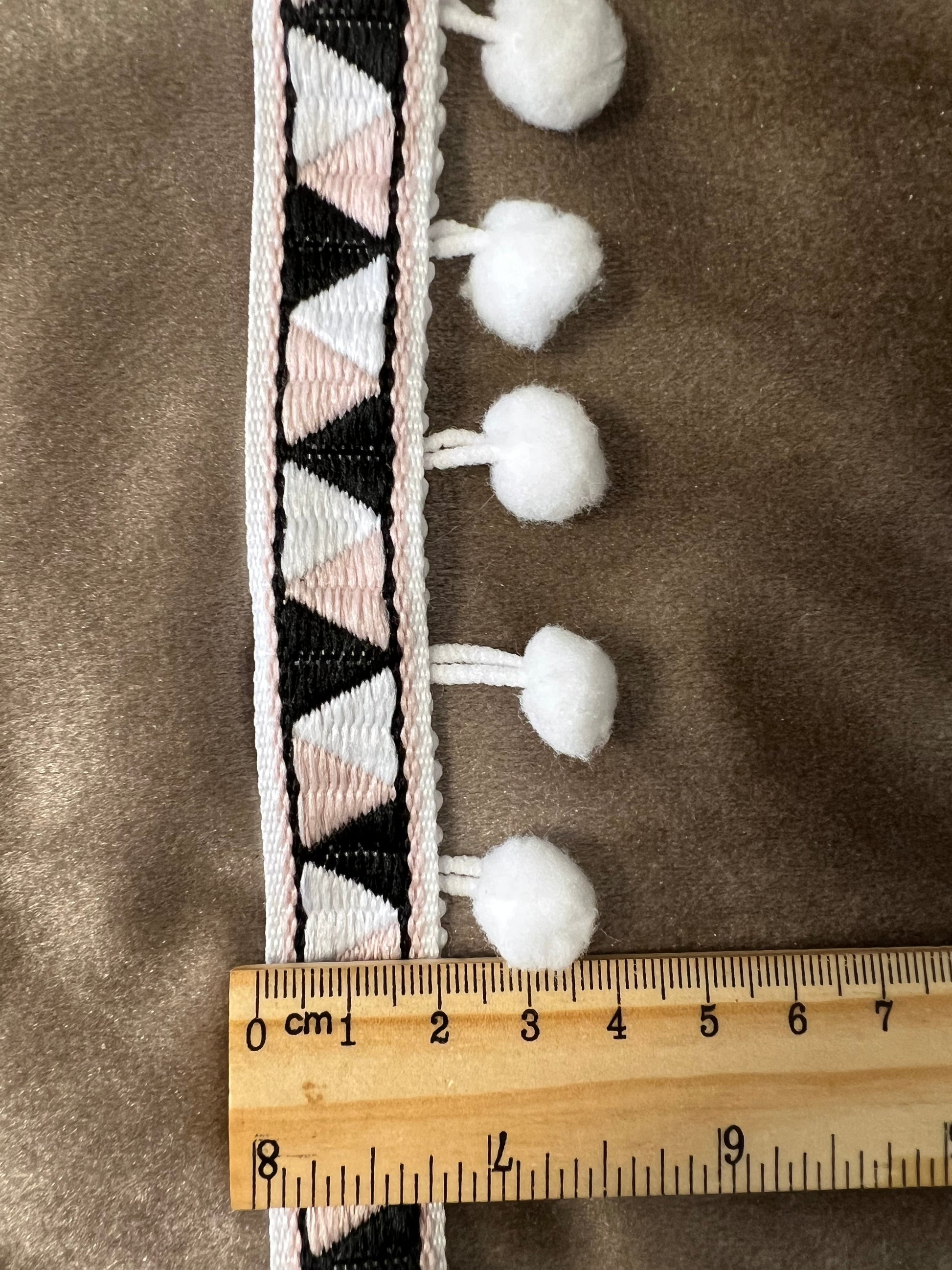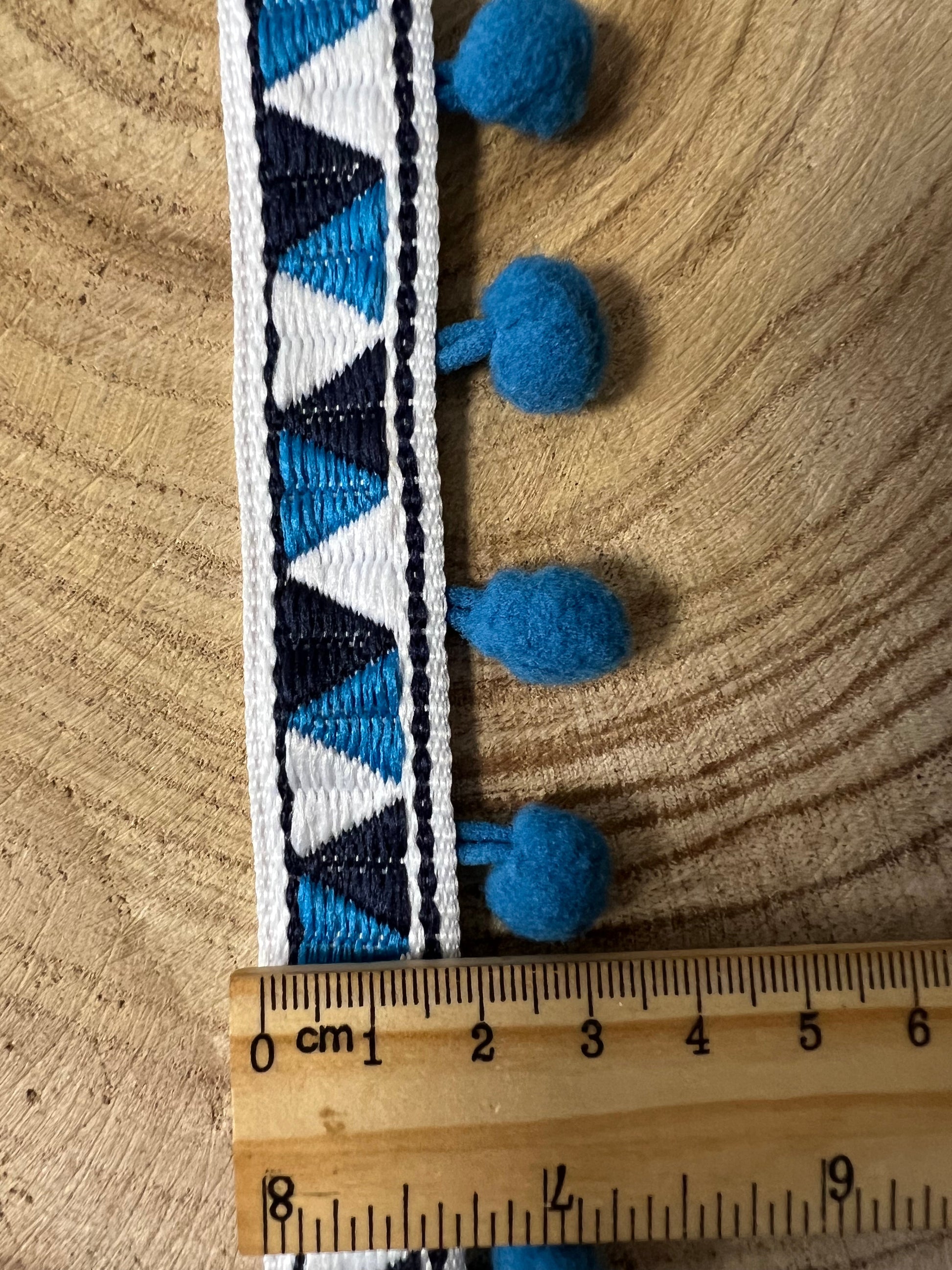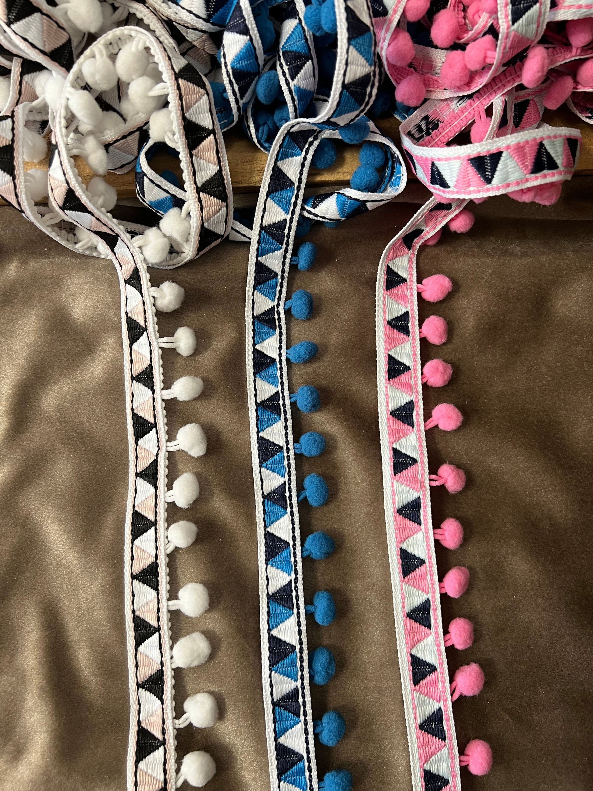 Galon à pompon frise pyramides. Largeur 3,5 cm. Différents coloris. Quantité très limitée.