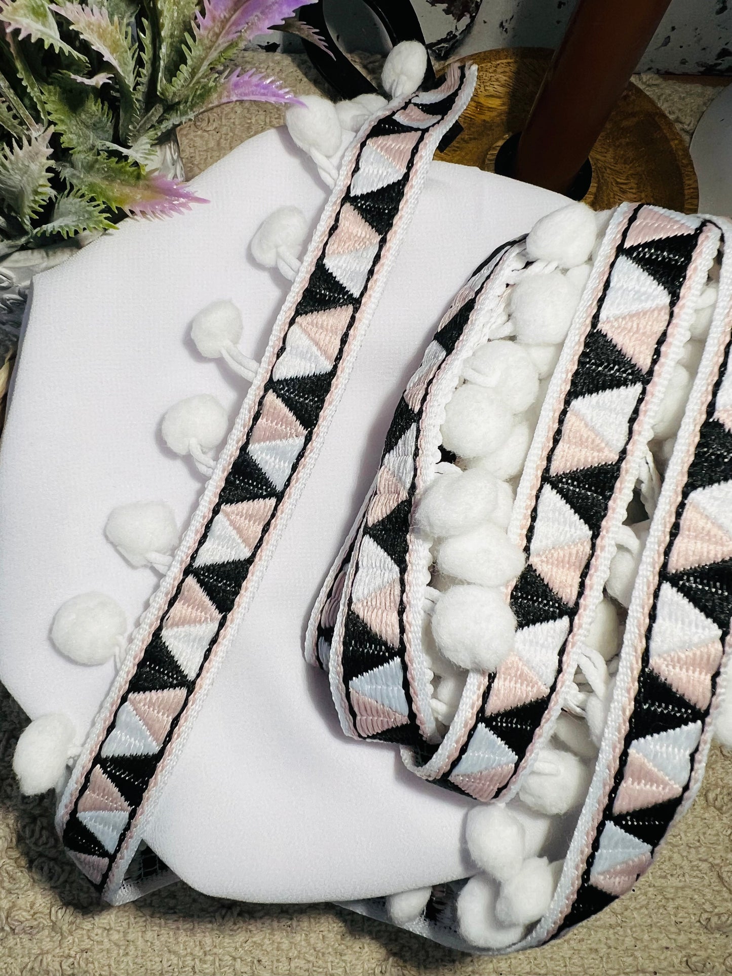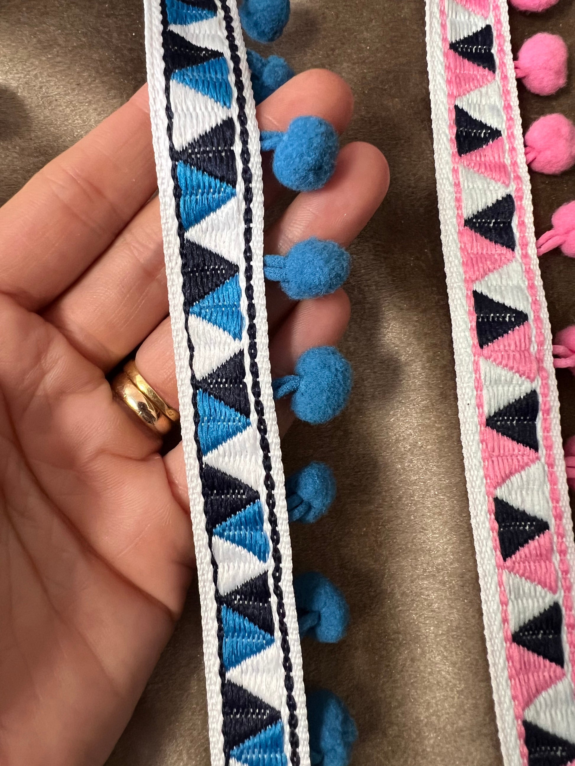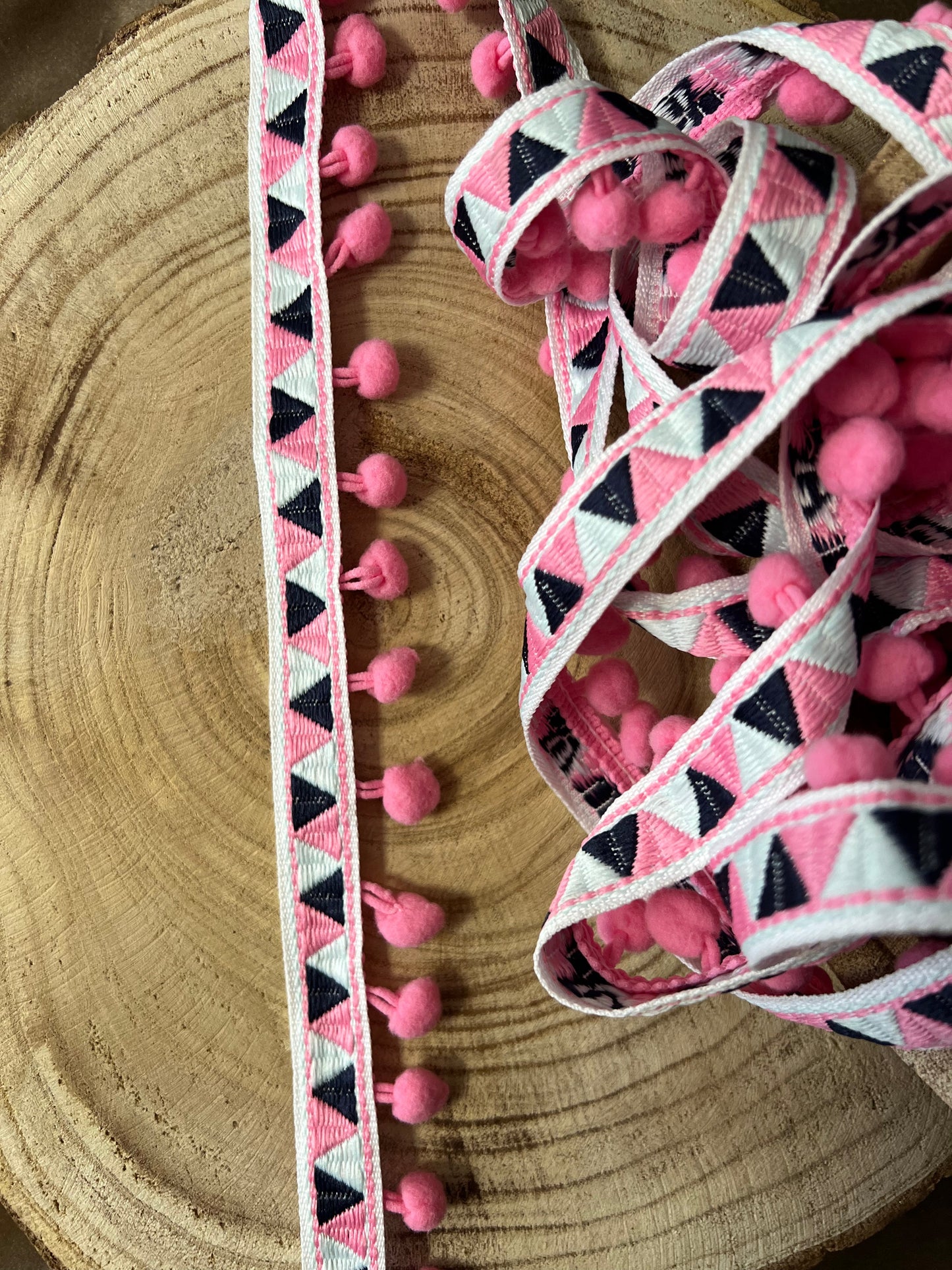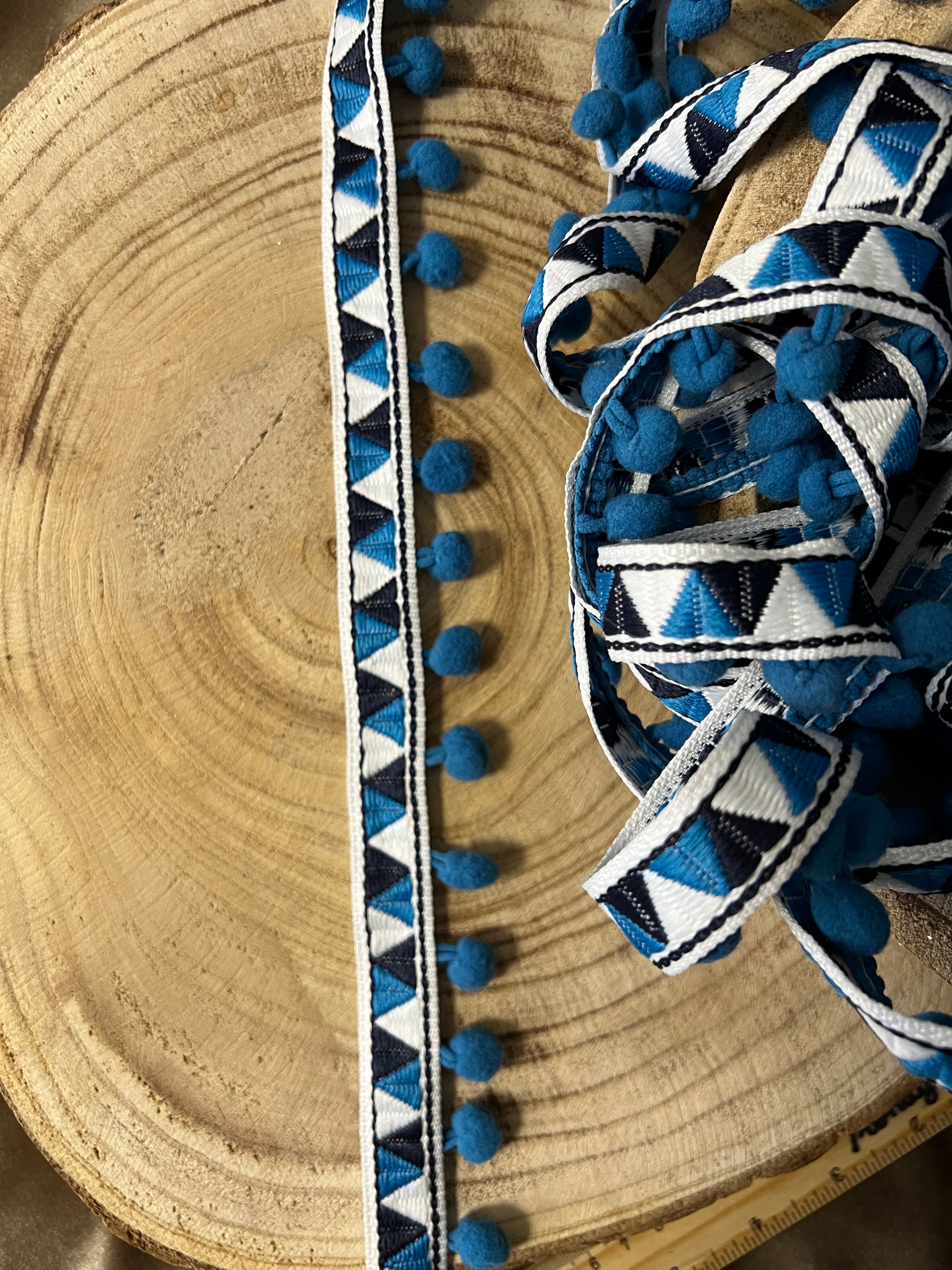 Galon à pompon frise pyramides. Largeur 3,5 cm. Différents coloris. Quantité très limitée.