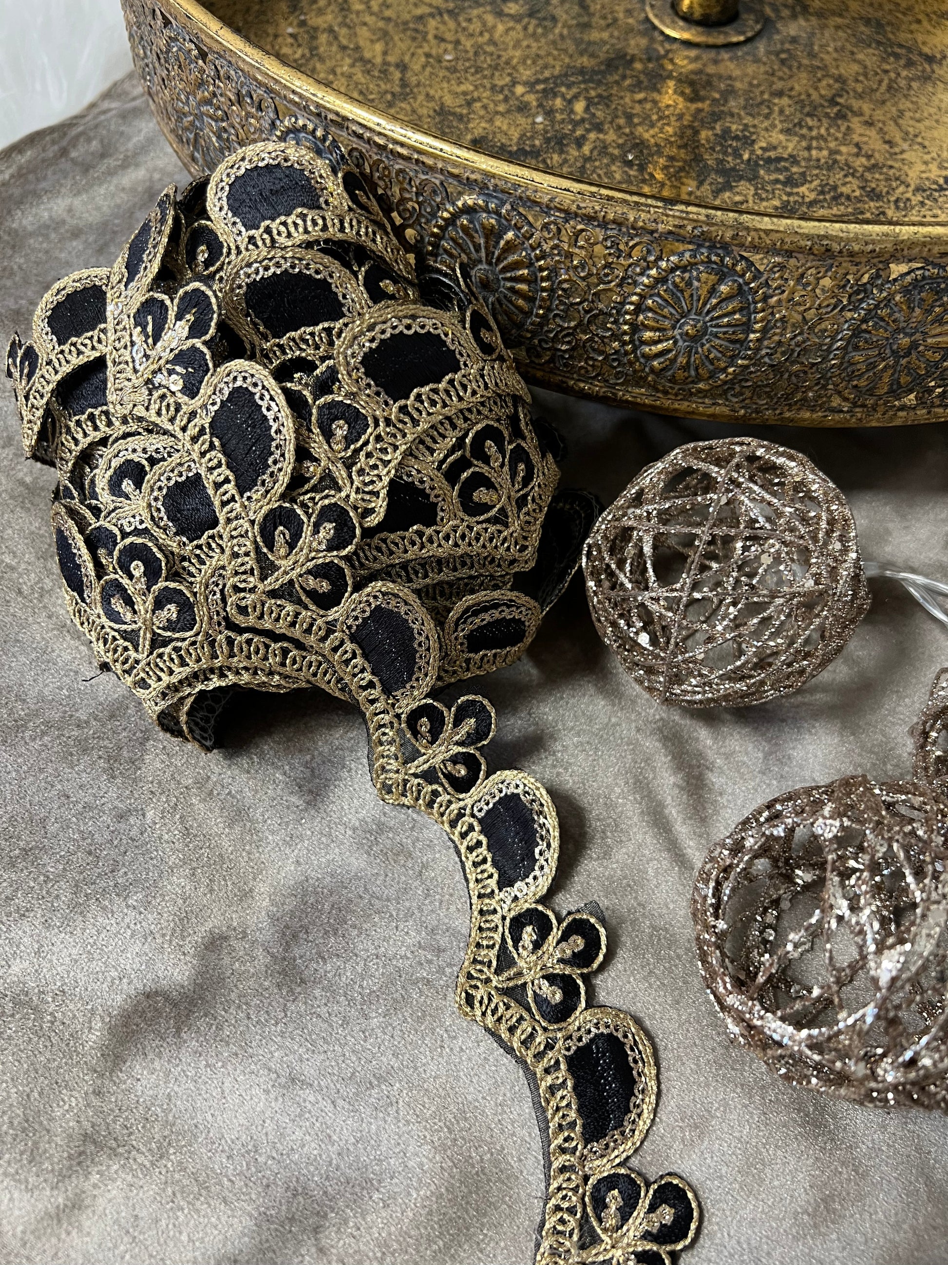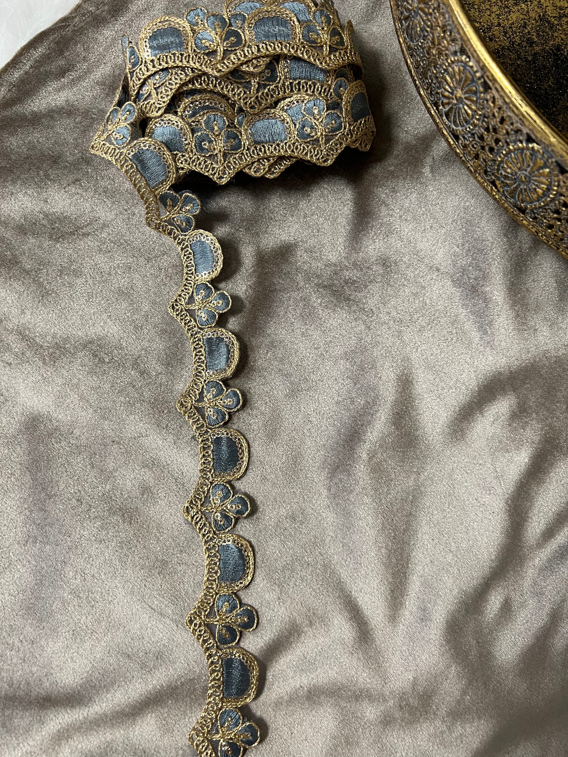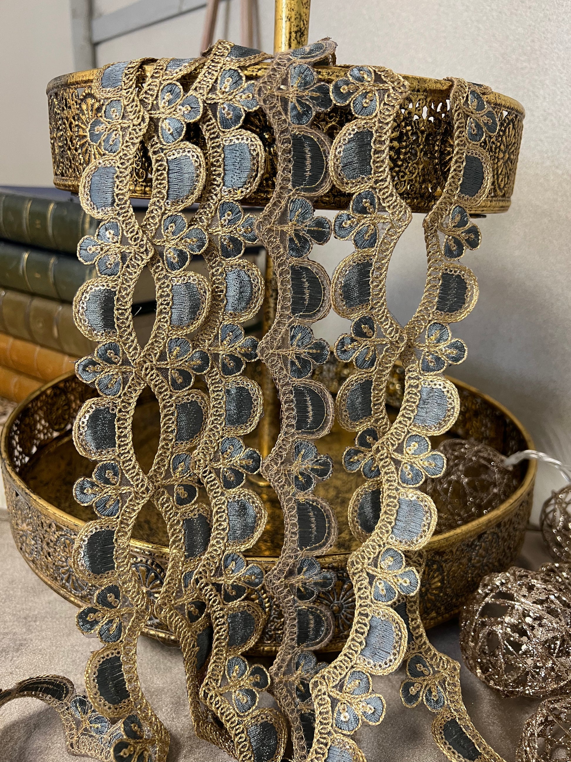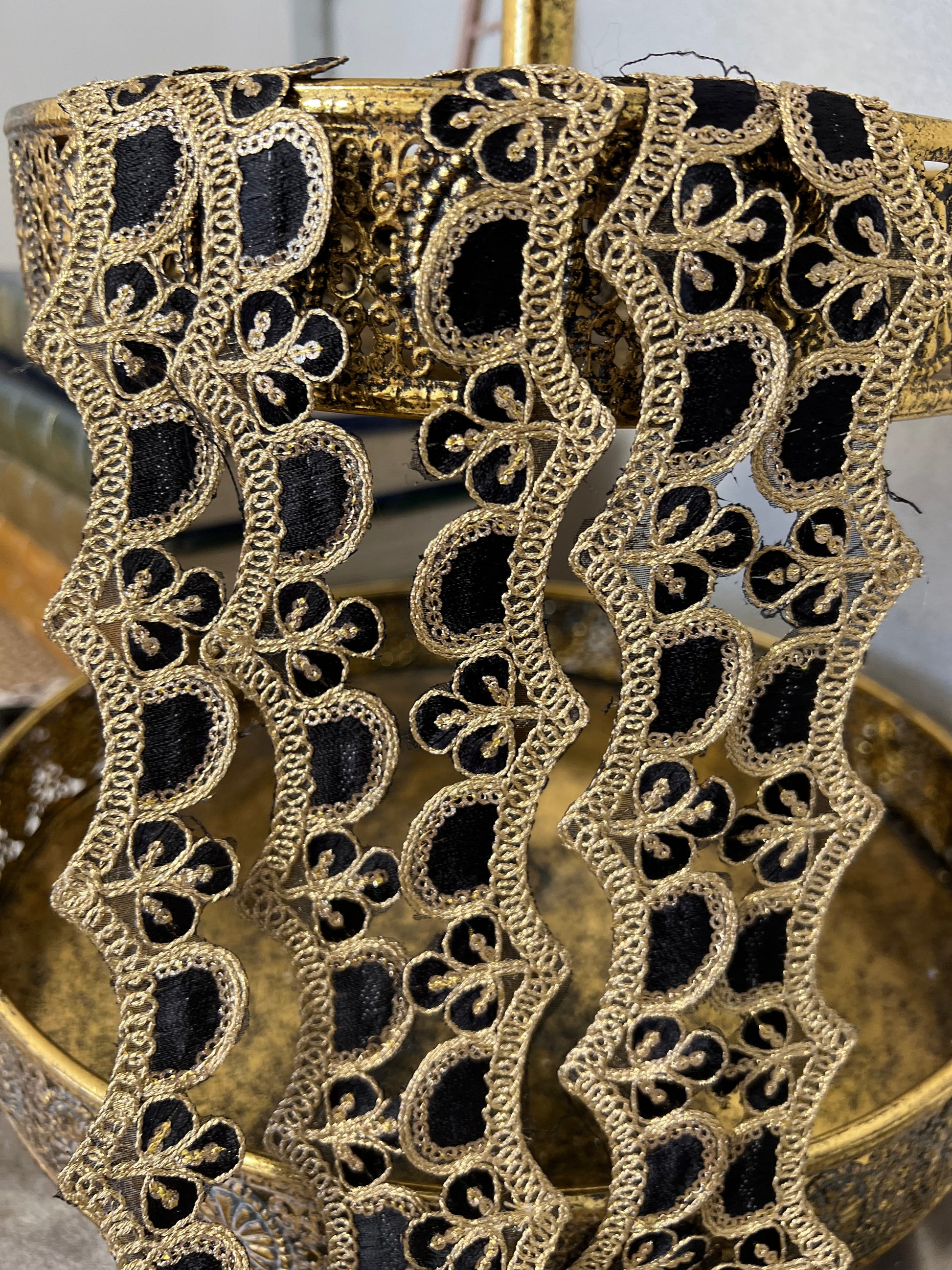 Galon arabesque. Largeur 3 cm. Différents coloris. Quantité très limitée.