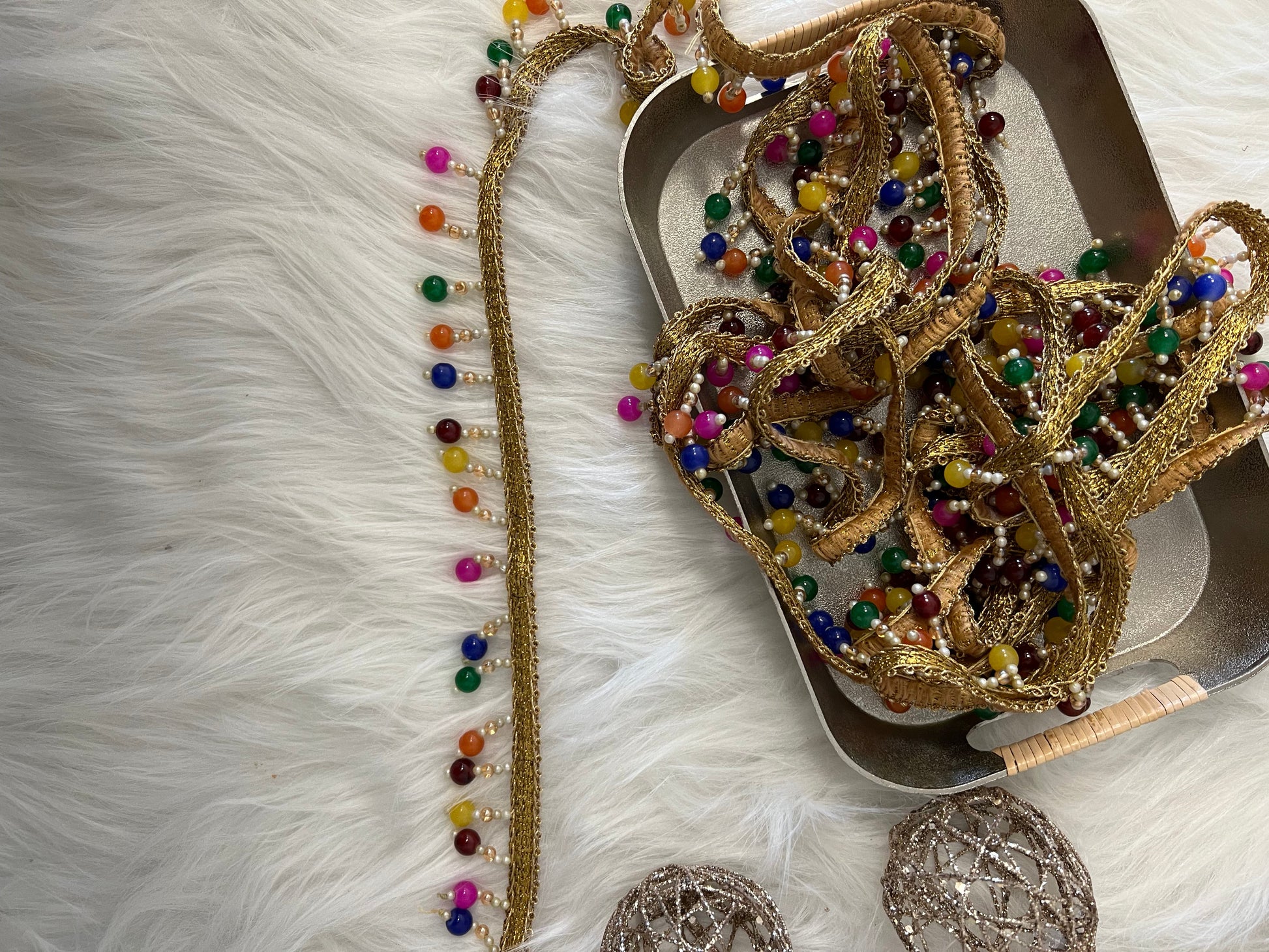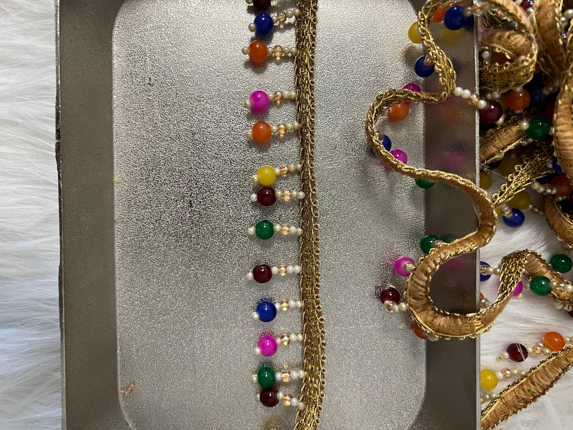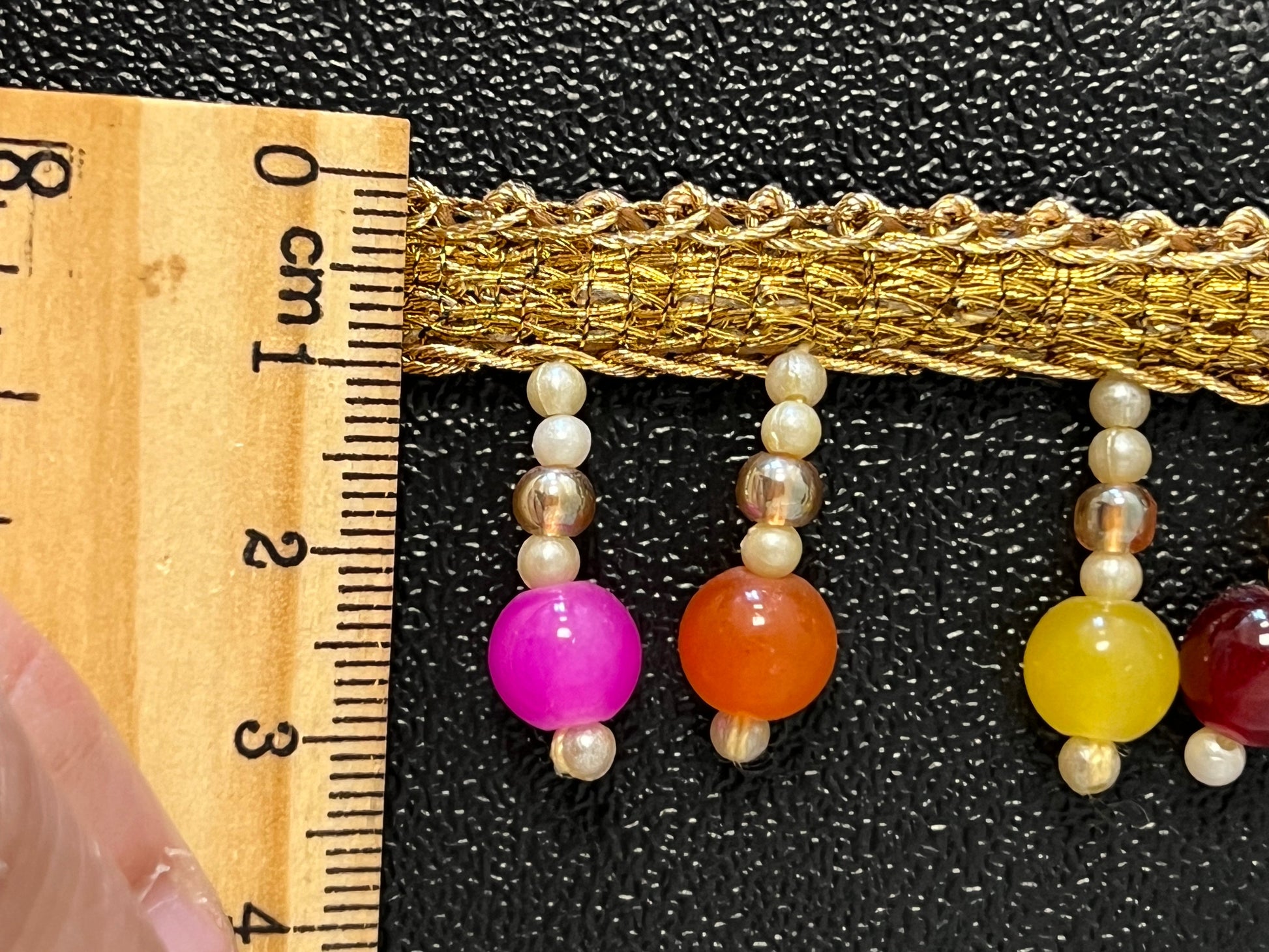 Galon avec perles multicolores/doré. Largeur 3,2 cm. Quantité très limitée.