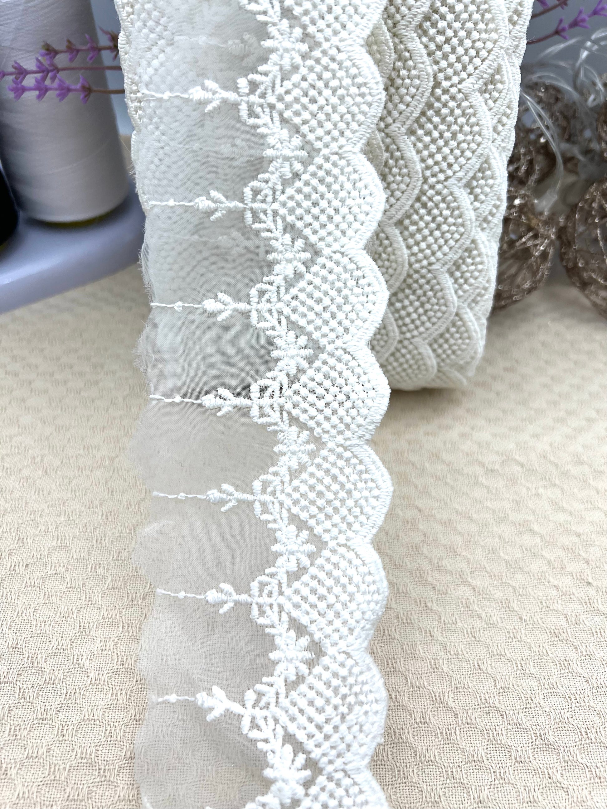 Ce galon brodé dentelle sur tulle séduit par sa délicatesse et son raffinement. Brodé sur une base fine et transparente, il présente une bordure ajourée en forme d’écailles et un motif régulier en fil ton sur ton. Ce modèle combine douceur et élégance, parfait pour vos créations couture ou décoratives.