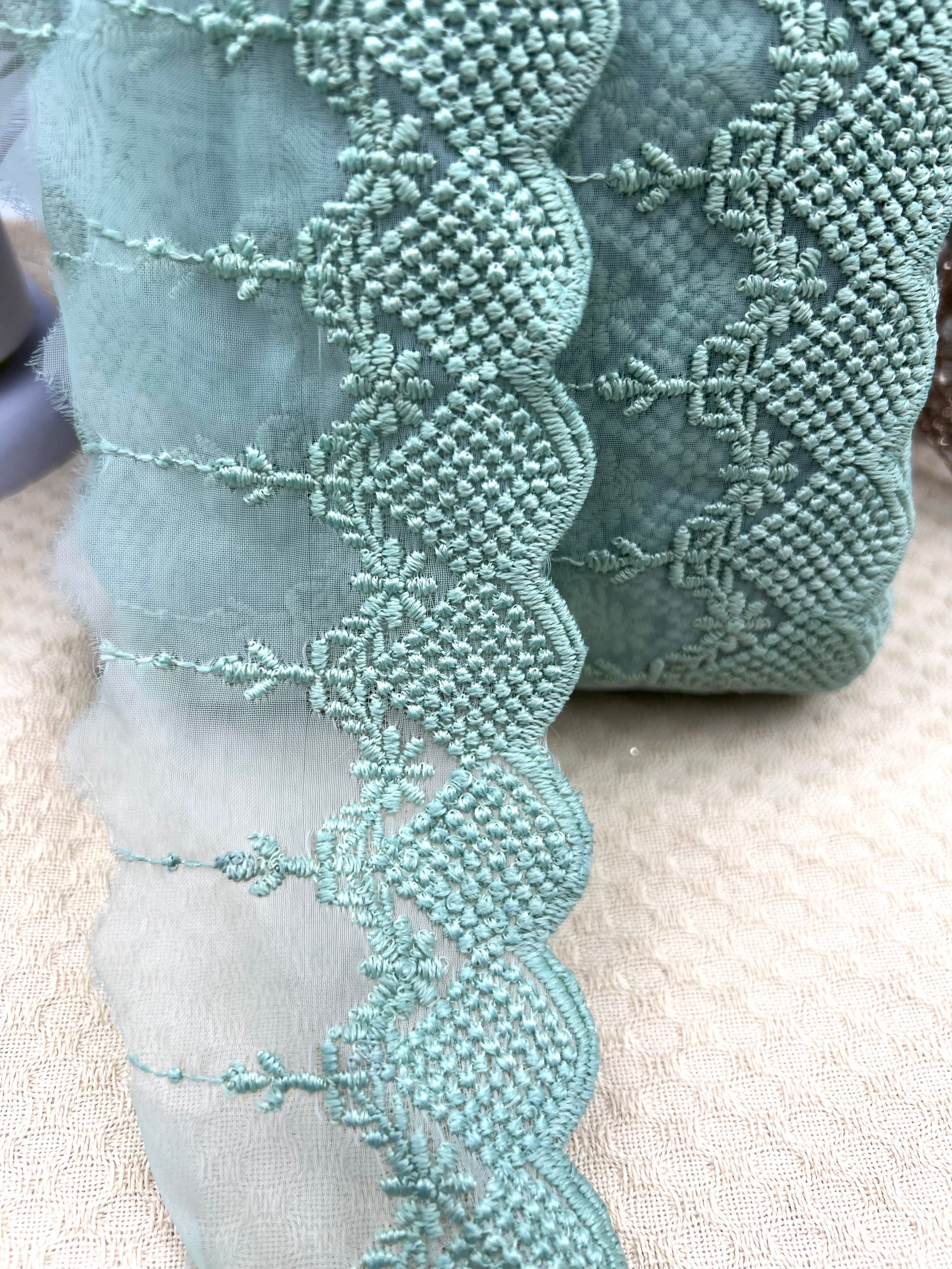 Galon brodé dentelle sur tulle – 3 coloris (rose, vert amande, écru)