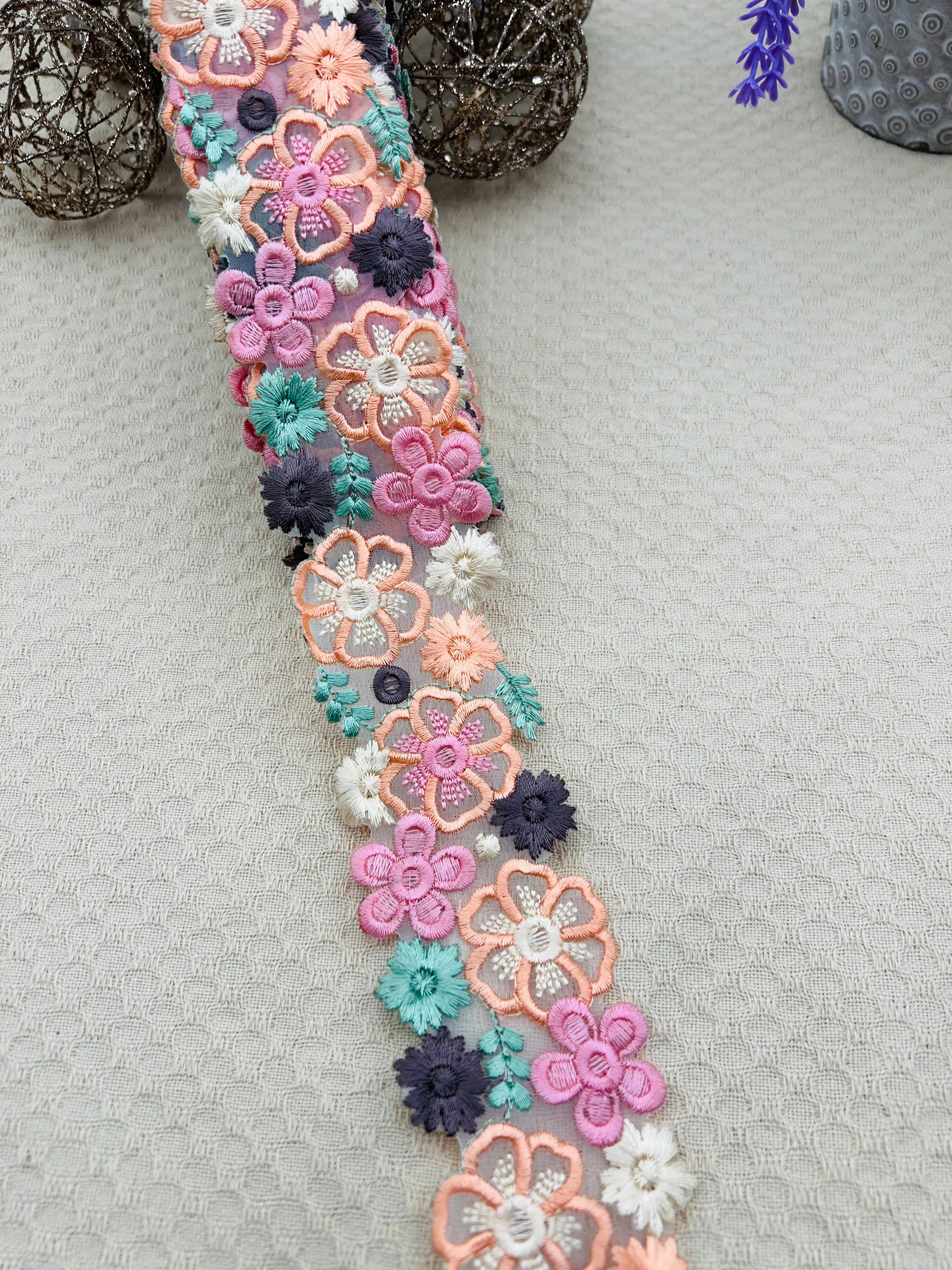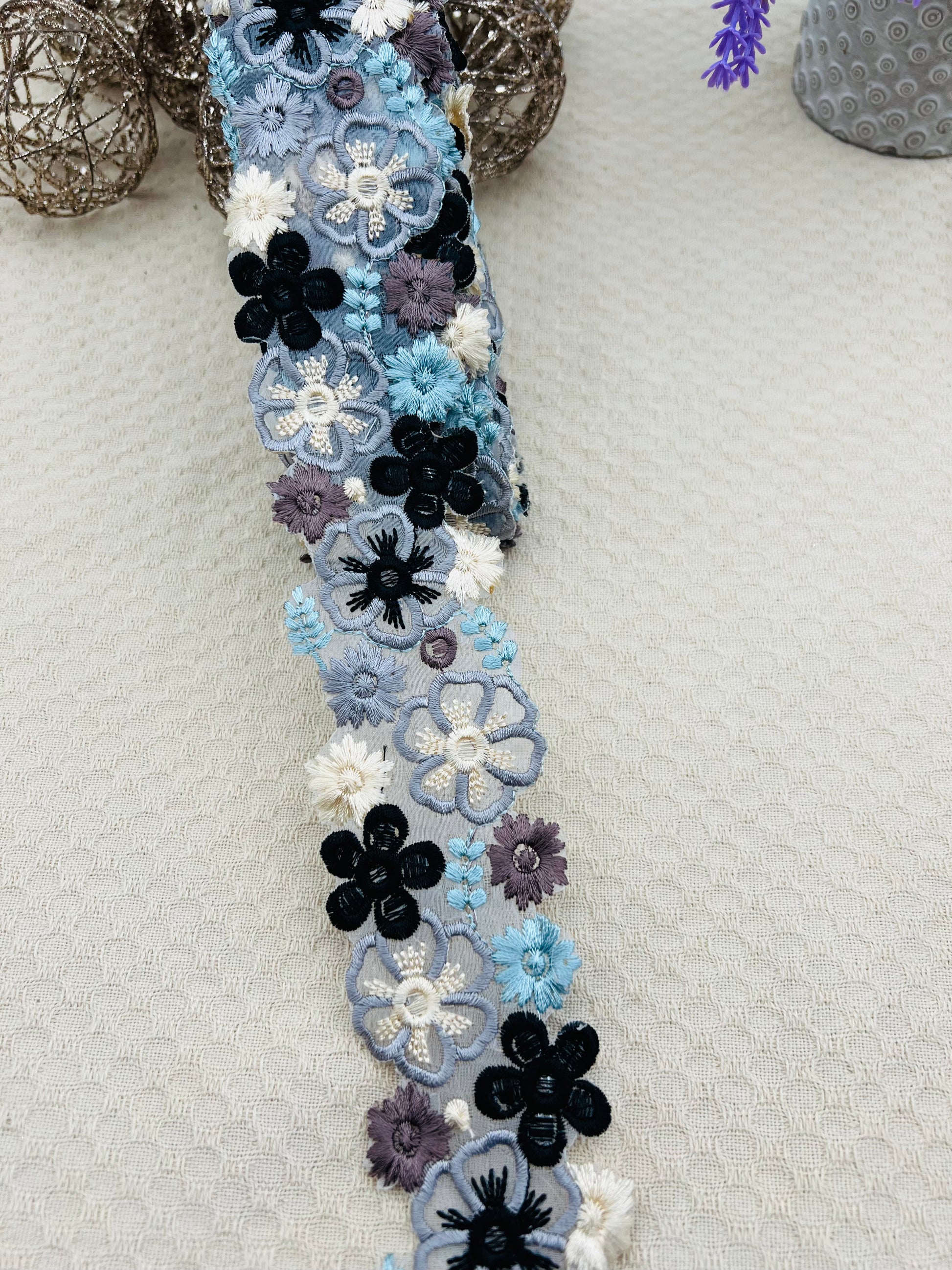 Ce galon brodé à fleurs en relief est disponible en trois coloris multicolores marron rose ou bleu gris. Idéal pour donner du volume et du style à vos vêtements, sacs, accessoires ou créations déco.