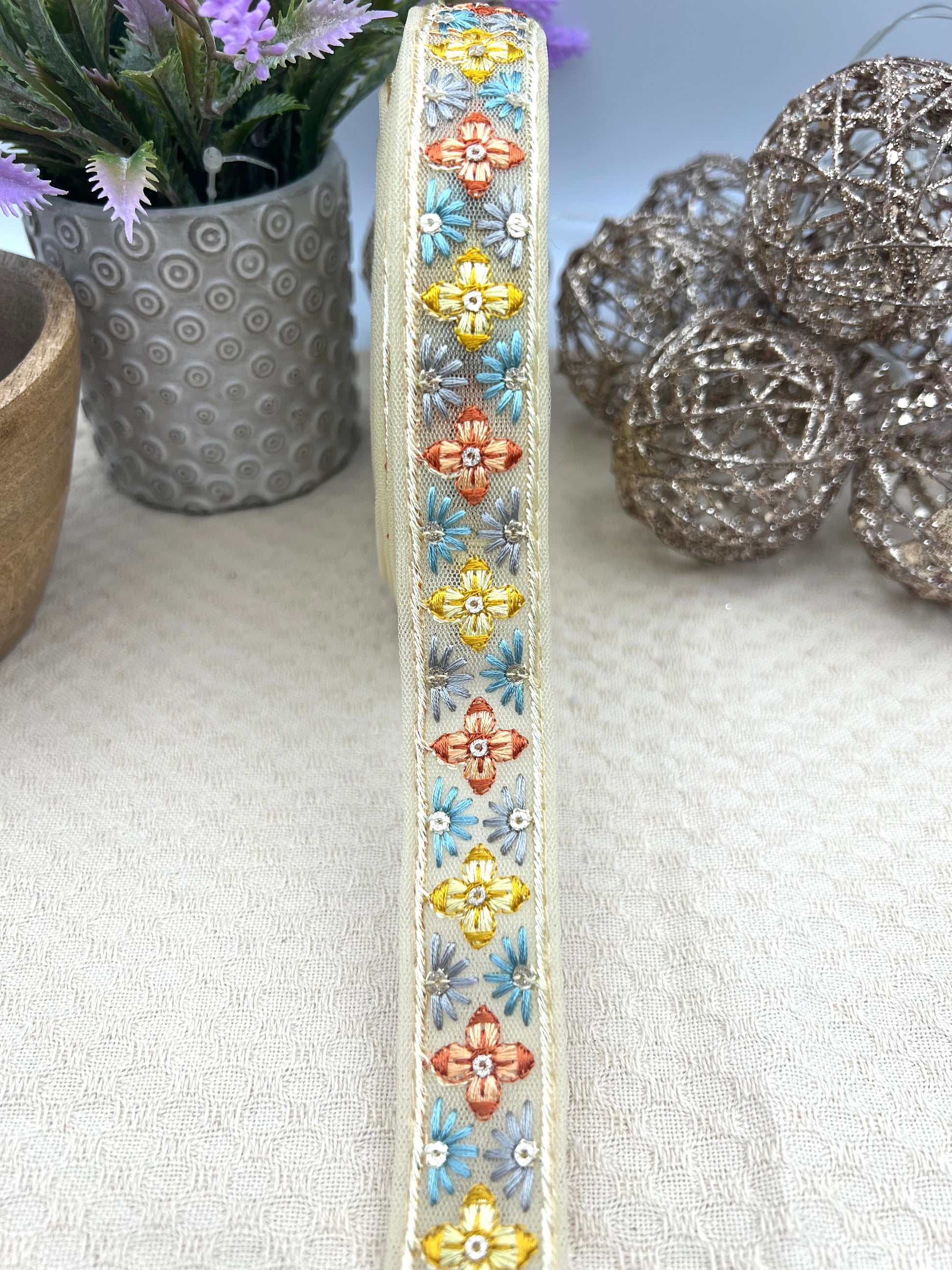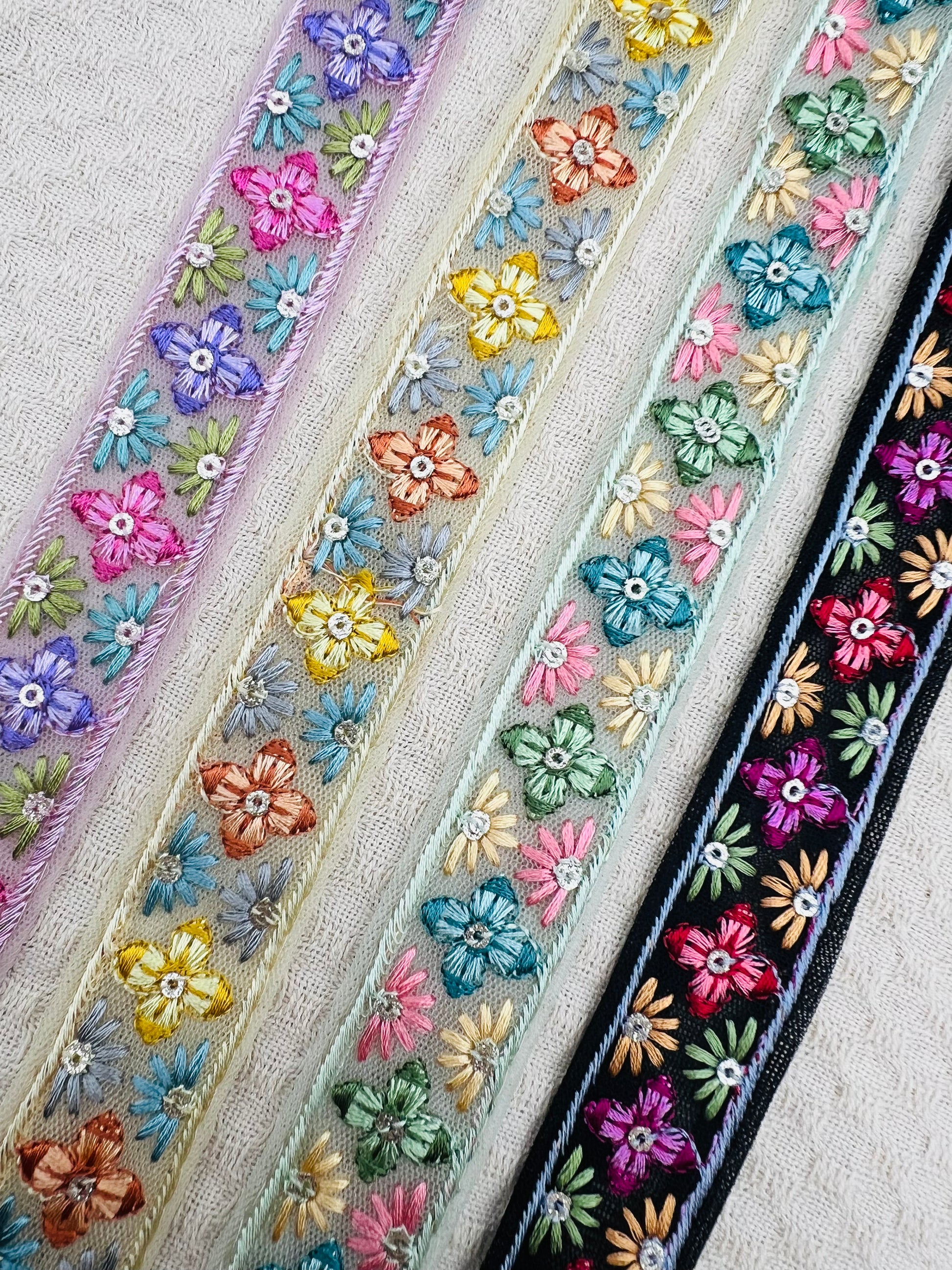 Ce galon brodé floral multicolore est un modèle plein de fraîcheur et de gaieté, idéal pour vos créations couture ou décoratives. Chaque galon est brodé sur une base fine et légèrement transparente, mettant en valeur de délicates fleurs colorées au relief raffiné.