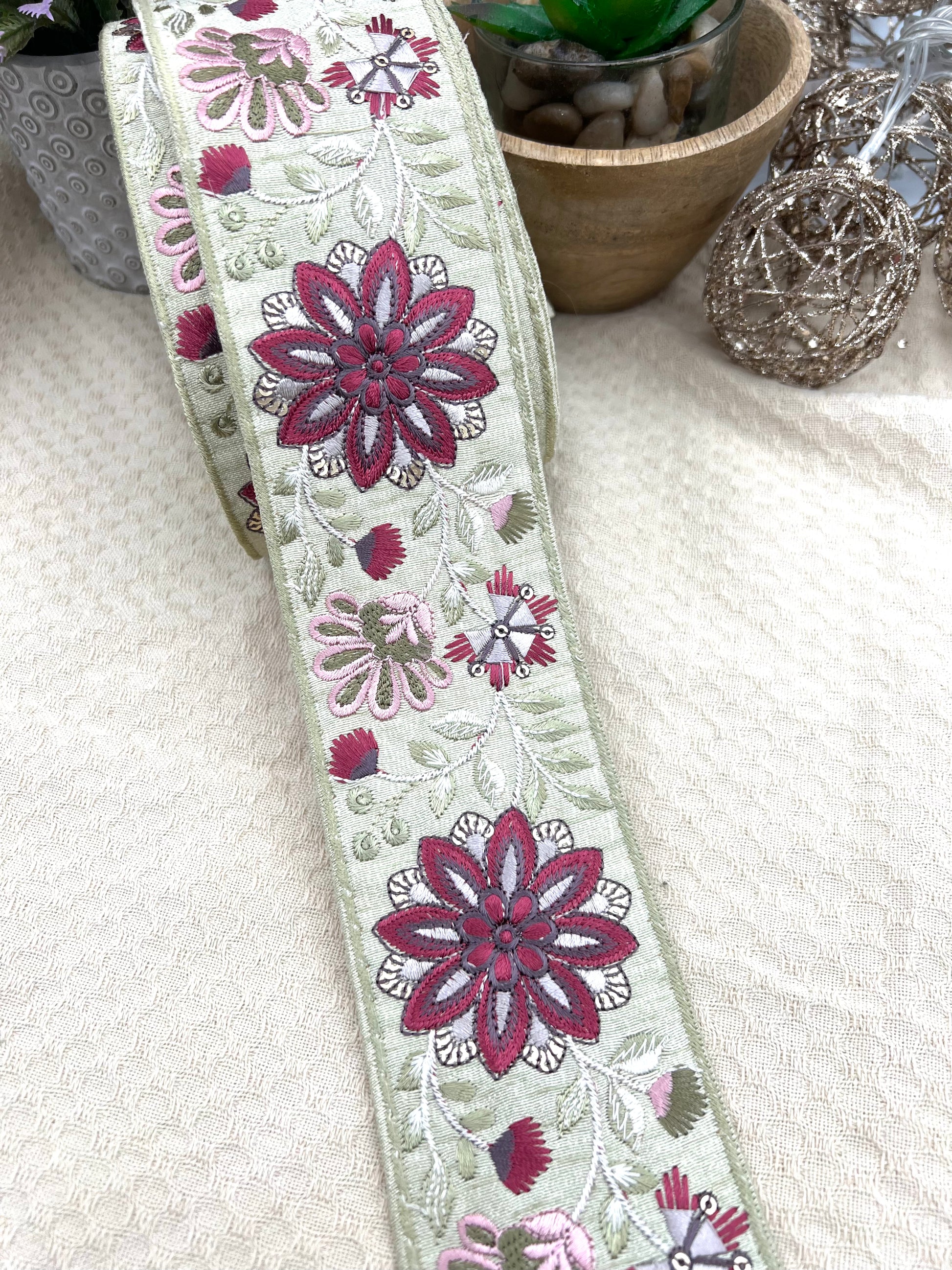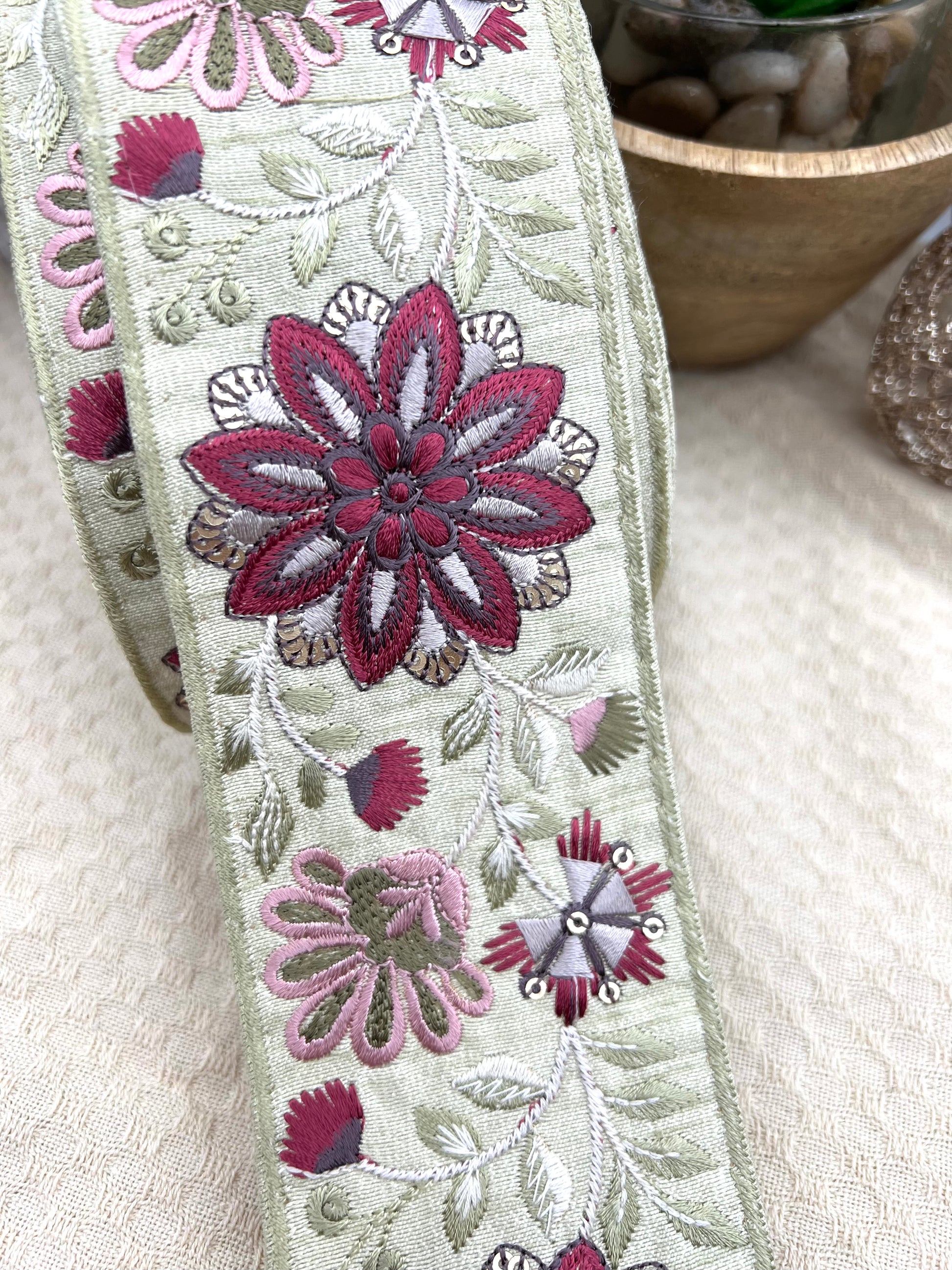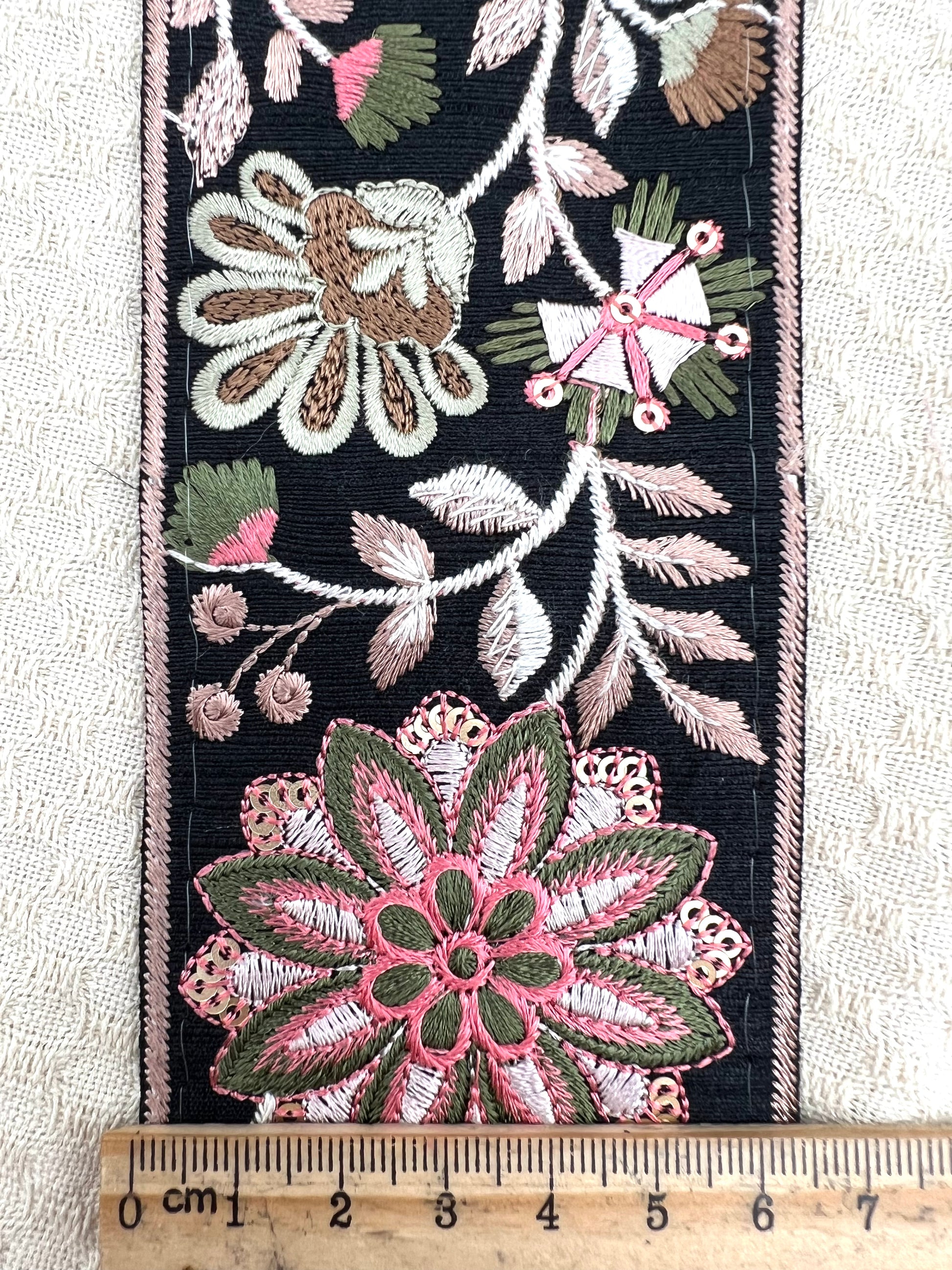 Ce galon brodé floral est une véritable pièce d’exception pour vos créations couture. Avec ses grandes fleurs délicatement brodées dans des tons de vieux rose, crème, vert sauge et beige sur fond noir profond ou vert doux, il apporte une touche à la fois raffinée et artisanale à tous vos projets.