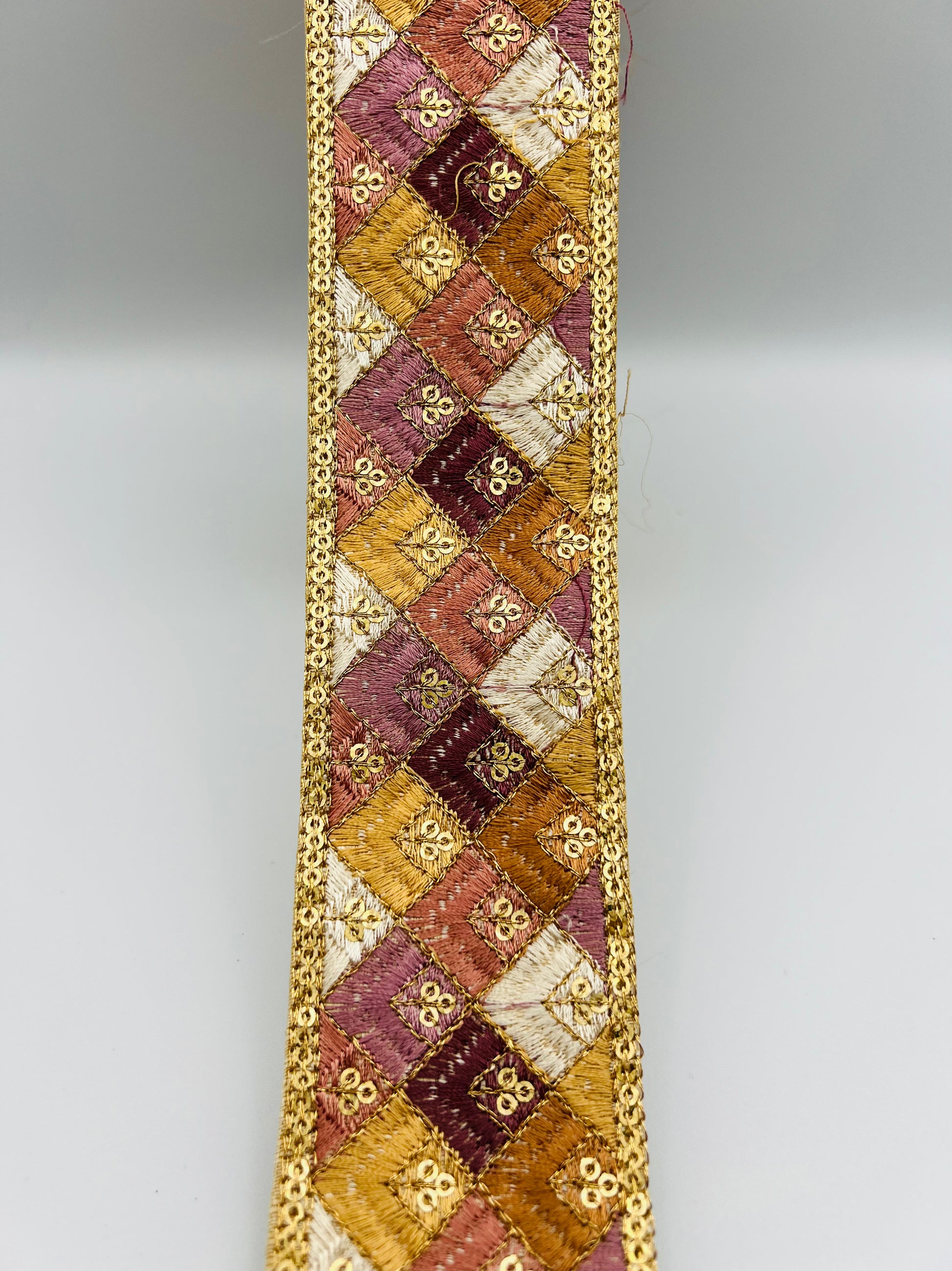 Galon Brodé à Losanges Dorés – Tons Jaunes ou Violet Prune au Choix