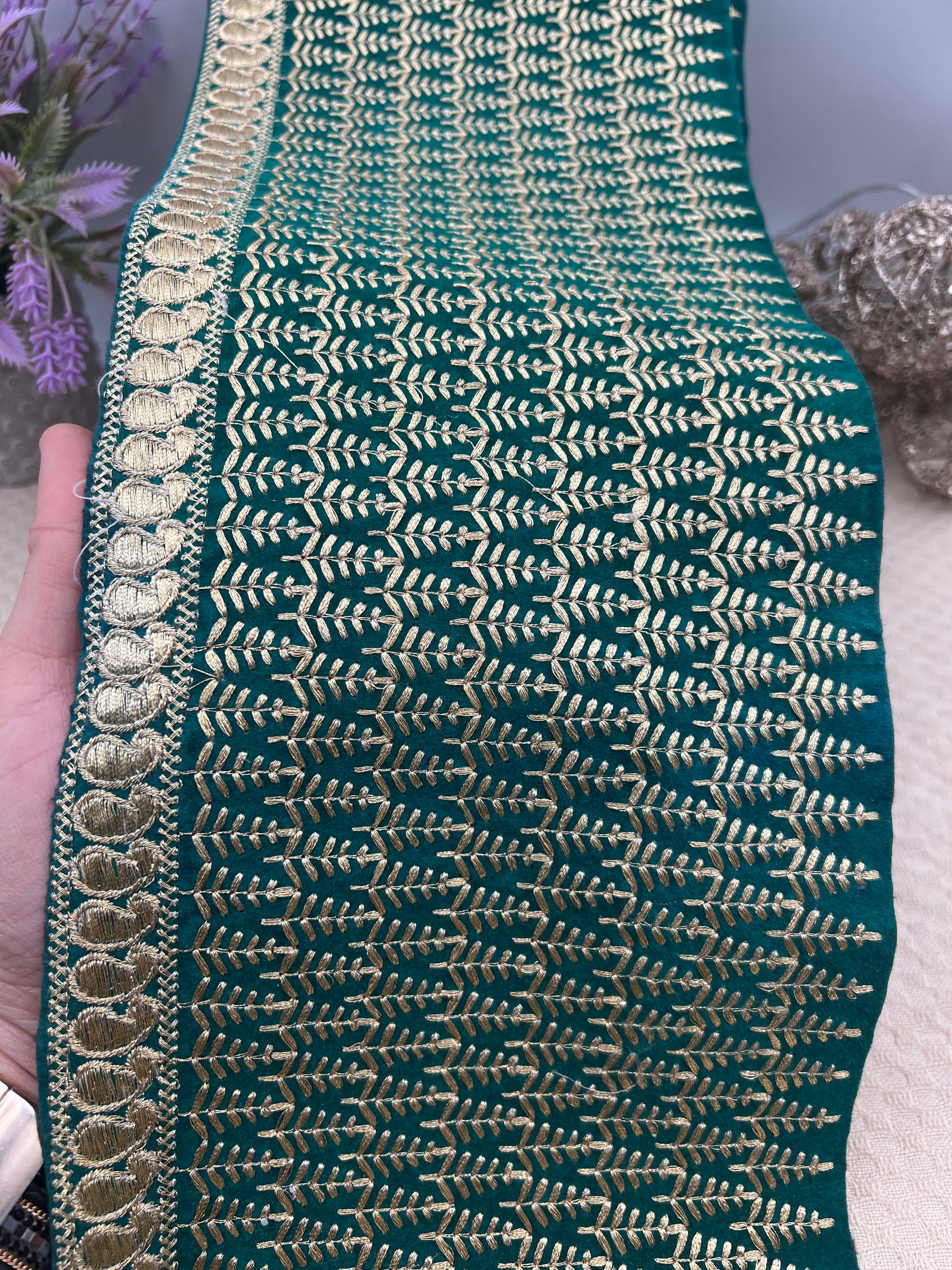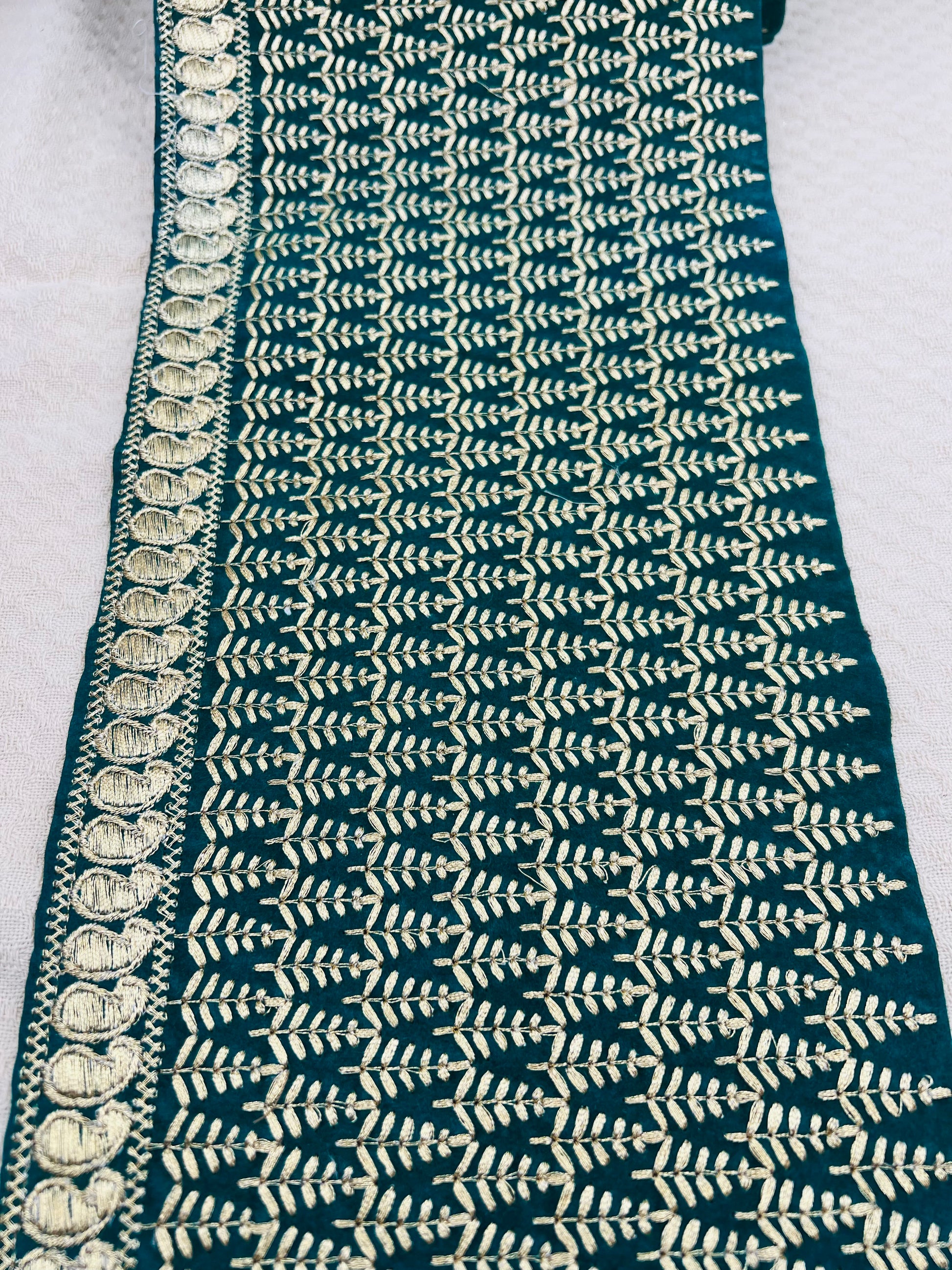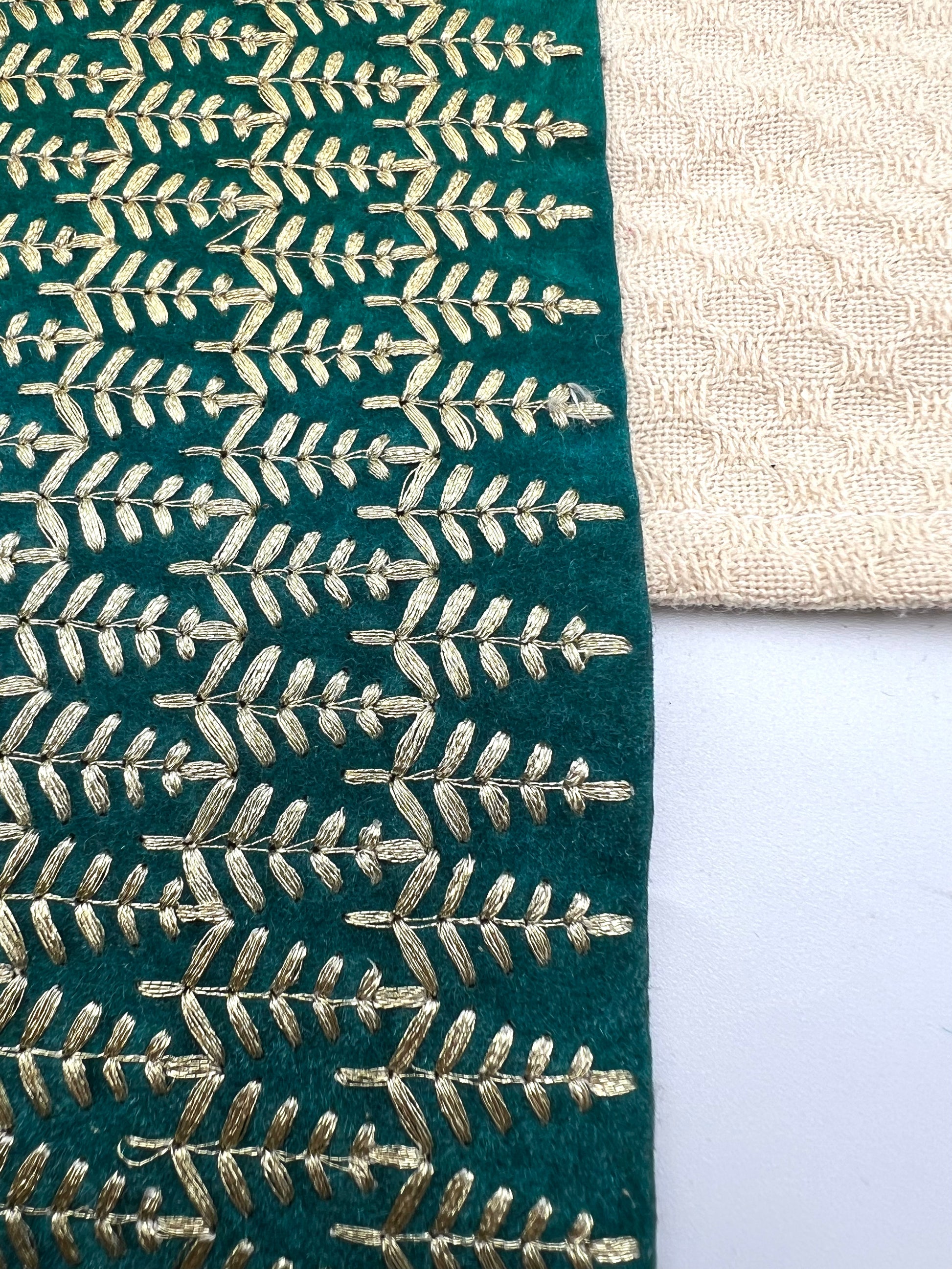 Ce galon brodé vert émeraude et doré allie élégance et finesse. Son fond vert profond met en valeur une superbe broderie dorée formant de petits motifs végétaux réguliers, inspirés de l’artisanat oriental. Ce modèle se distingue par son éclat subtil et sa texture soignée.
