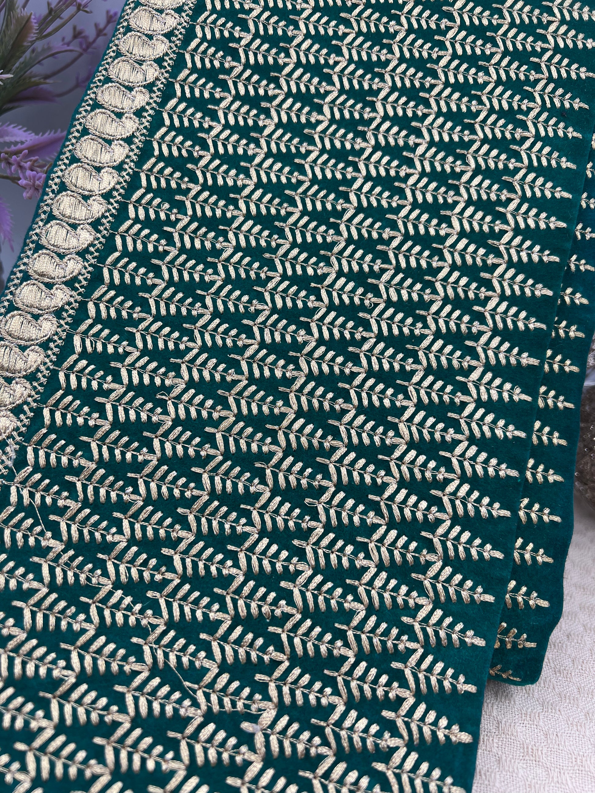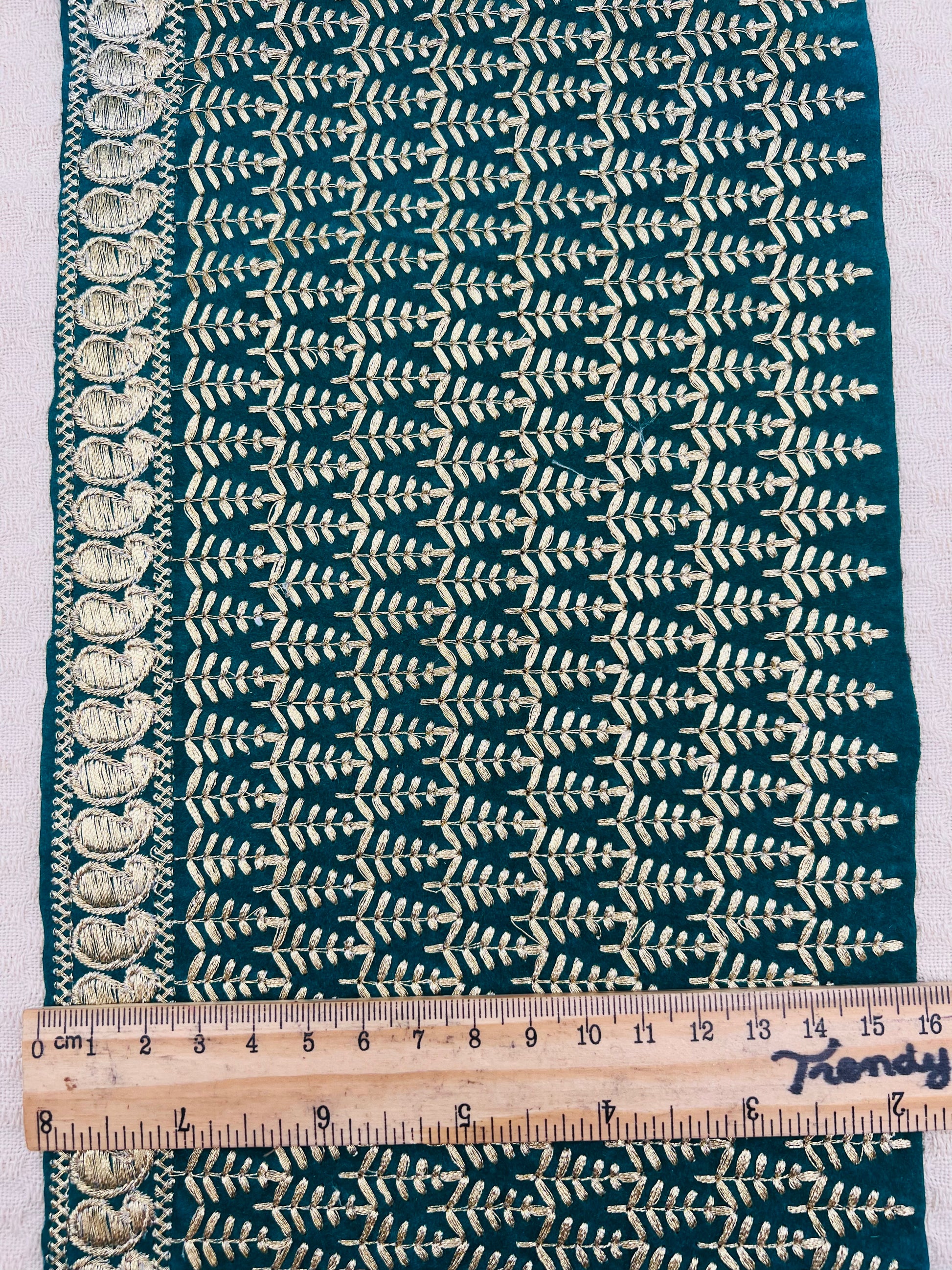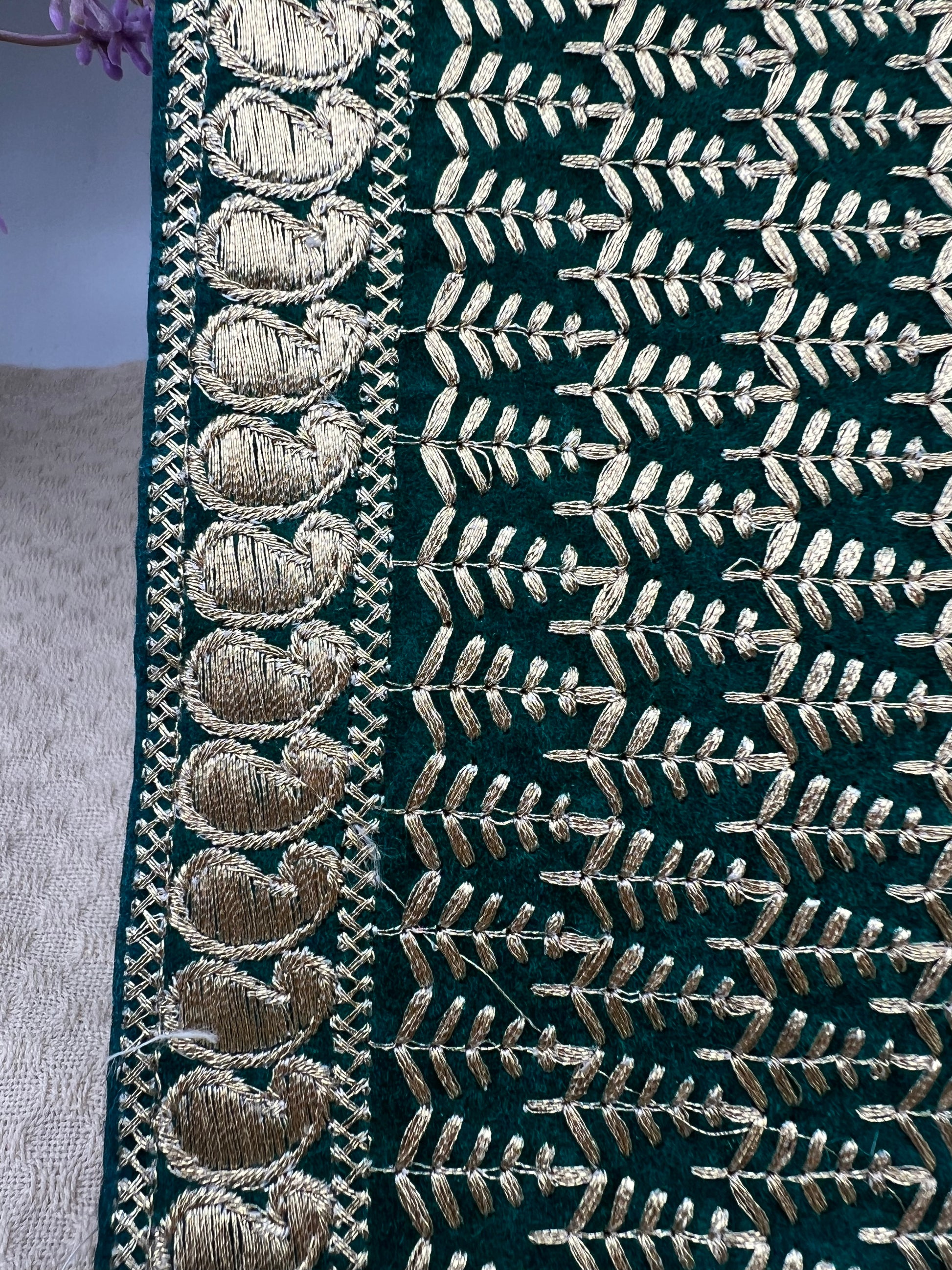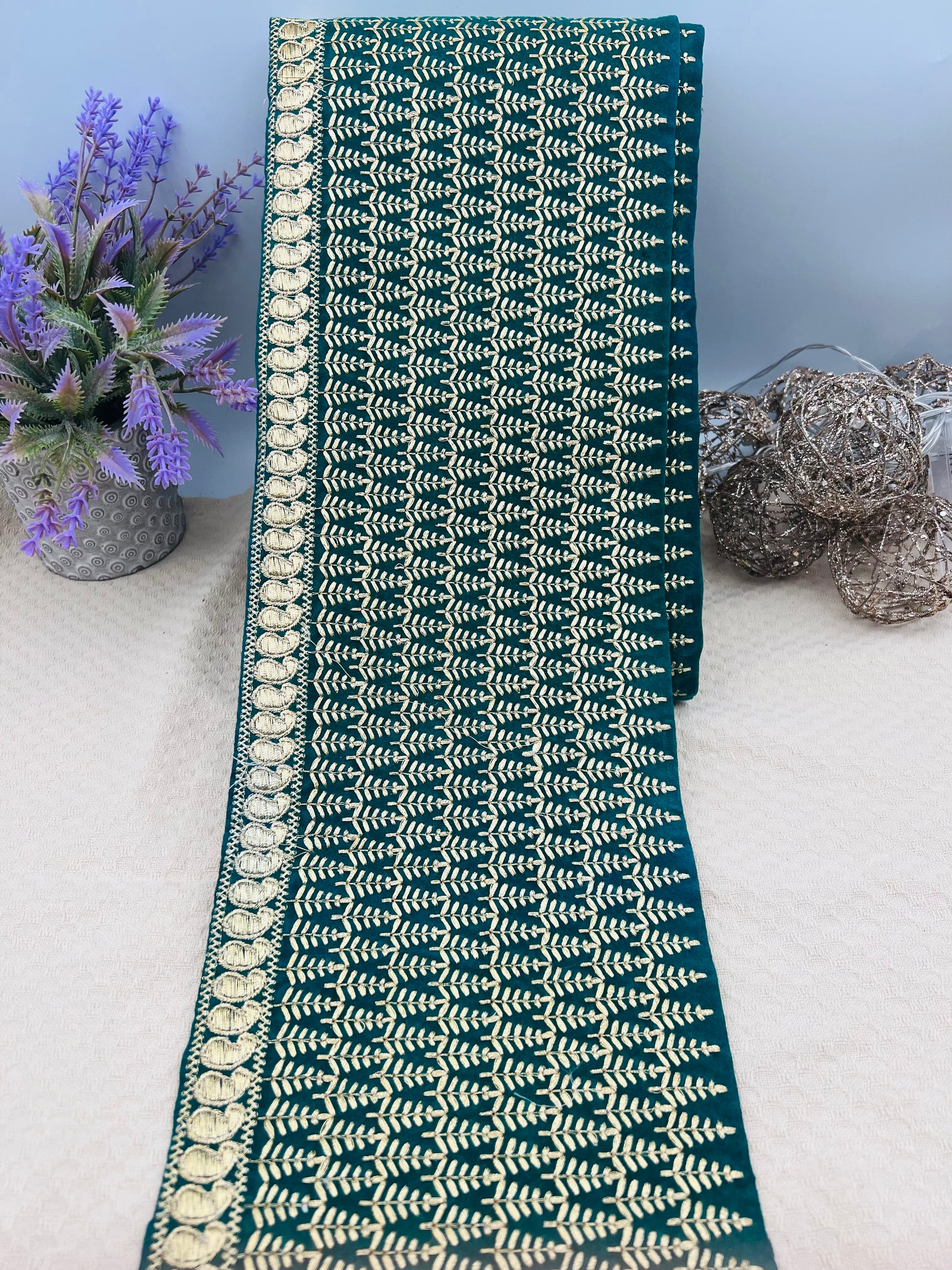 Ce galon brodé vert émeraude et doré allie élégance et finesse. Son fond vert profond met en valeur une superbe broderie dorée formant de petits motifs végétaux réguliers, inspirés de l’artisanat oriental. Ce modèle se distingue par son éclat subtil et sa texture soignée.