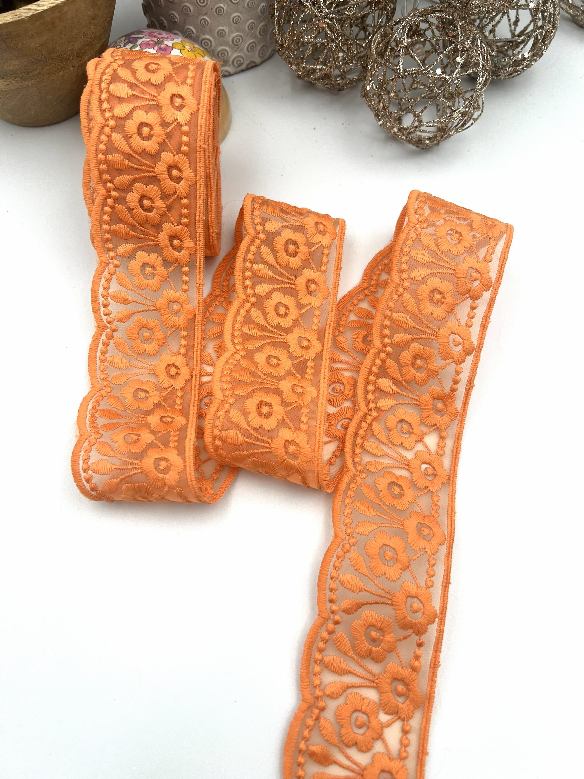 Ce galon en dentelle brodée orange apporte une touche chaleureuse et lumineuse à toutes vos créations couture. Ses motifs floraux délicatement brodés et sa bordure ondulée en font un galon décoratif idéal pour sublimer vêtements, accessoires et projets textiles.