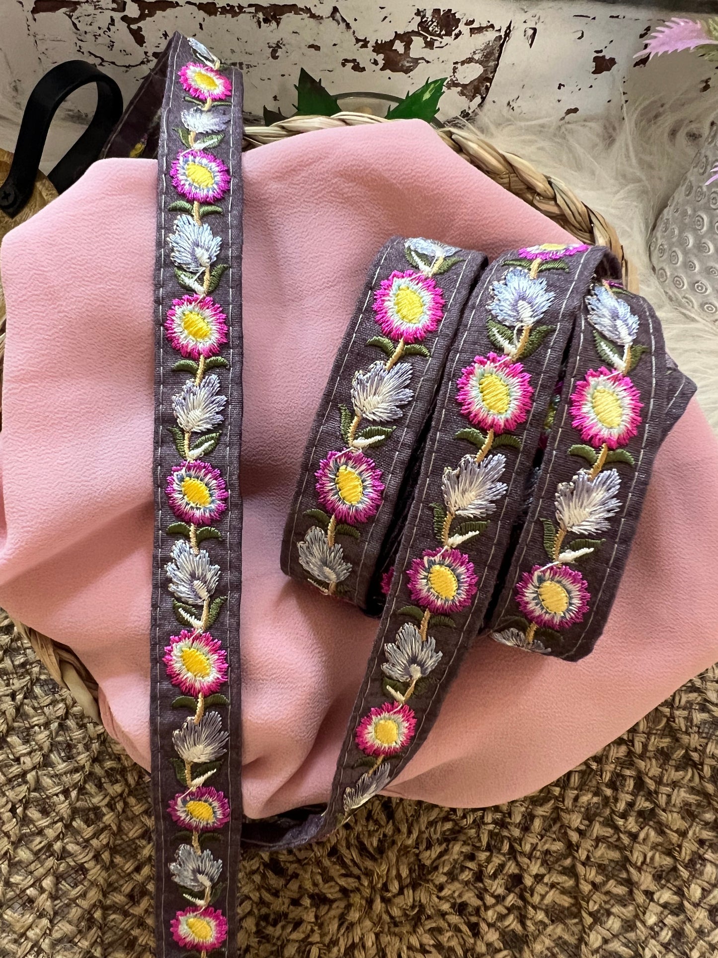 Galon fin brodé de fleurs successives. Largeur 2 cm. Différents coloris. Quantité très limitée.