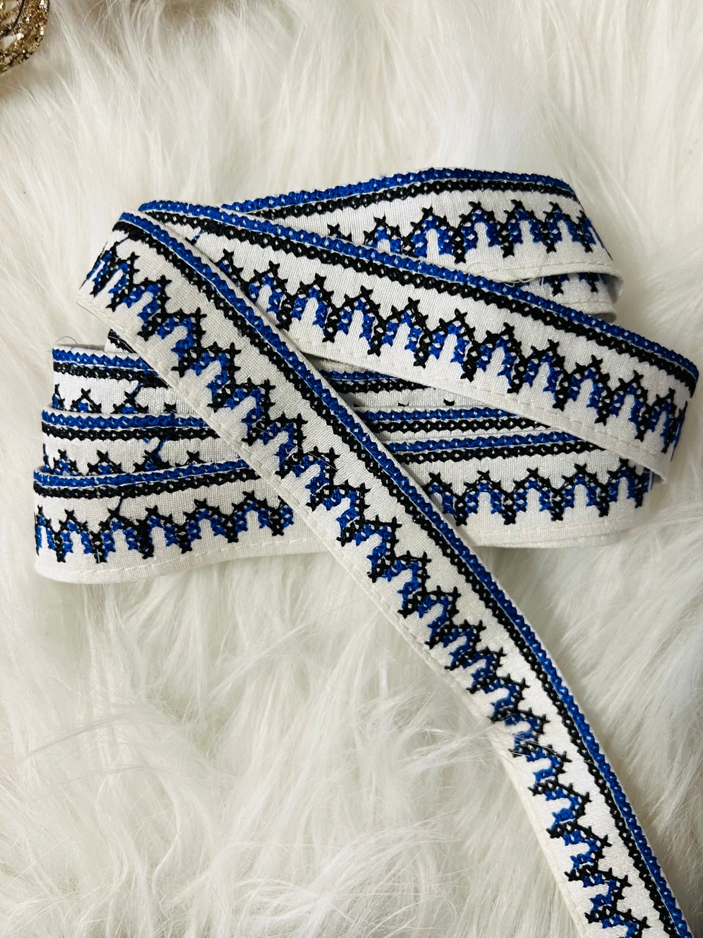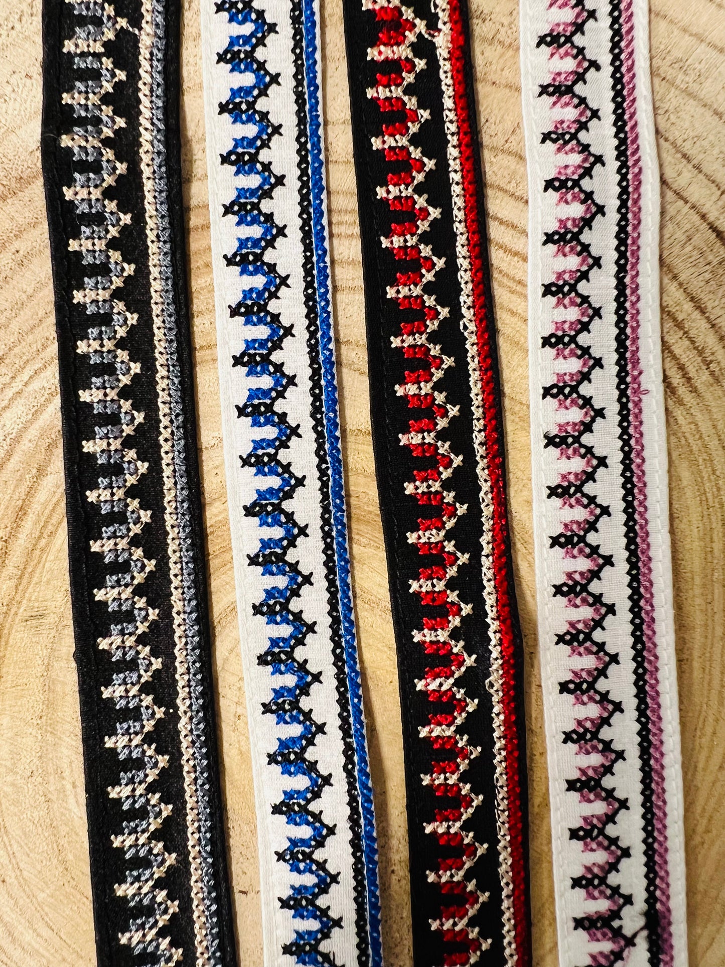 Galon fin brodé en points de croix chapiteau. Largeur 2,5 cm. Différents coloris. Quantité très limitée.