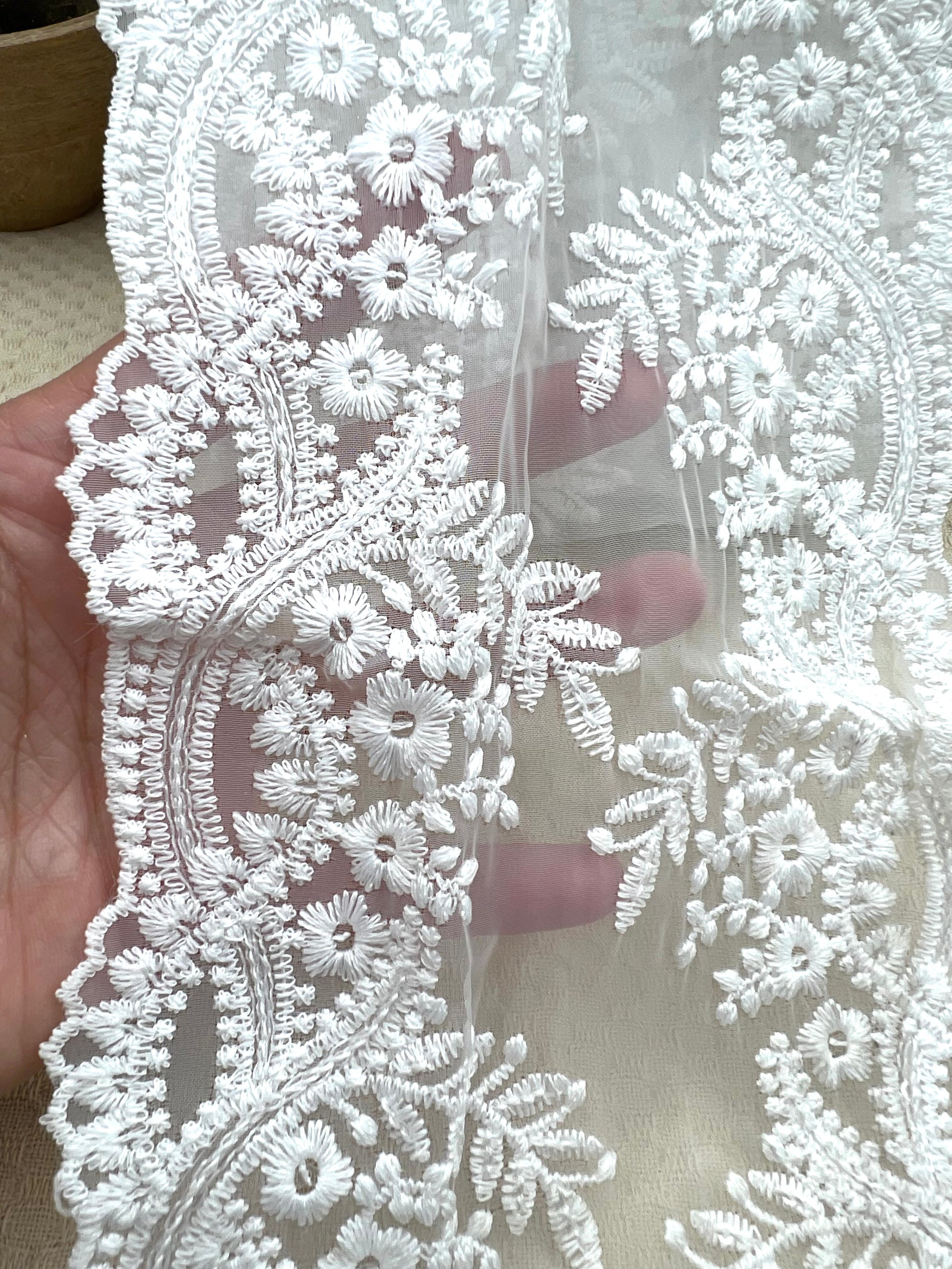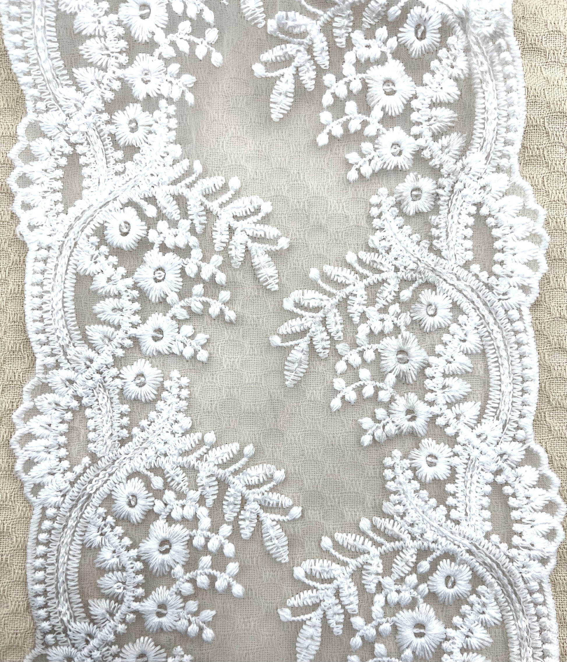 Ce galon brodé blanc à sequins discrets est un modèle raffiné et lumineux, parfait pour vos créations couture les plus élégantes. Brodé sur une base fine et transparente, il présente de magnifiques motifs floraux et feuillagés agrémentés de petits sequins blancs. Subtils et délicats, ces sequins captent la lumière sans excès, apportant une légère brillance en mouvement qui donne vie à l’ensemble.