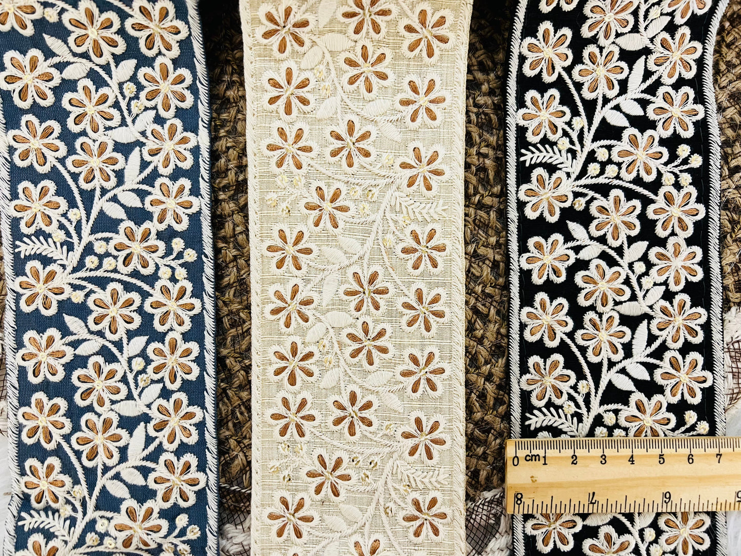 Galon large délicatement brodé et tissé à fleurs. Largeur 7,5 cm. Différents coloris. Quantité très limitée.