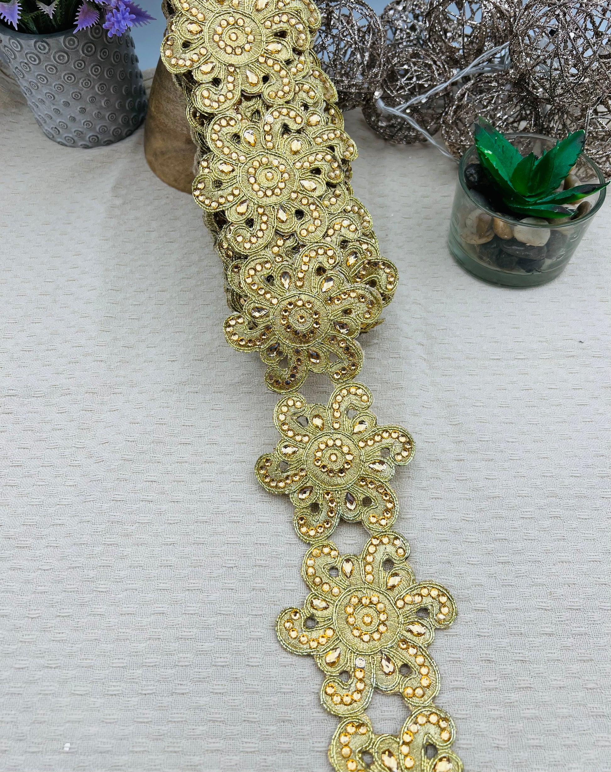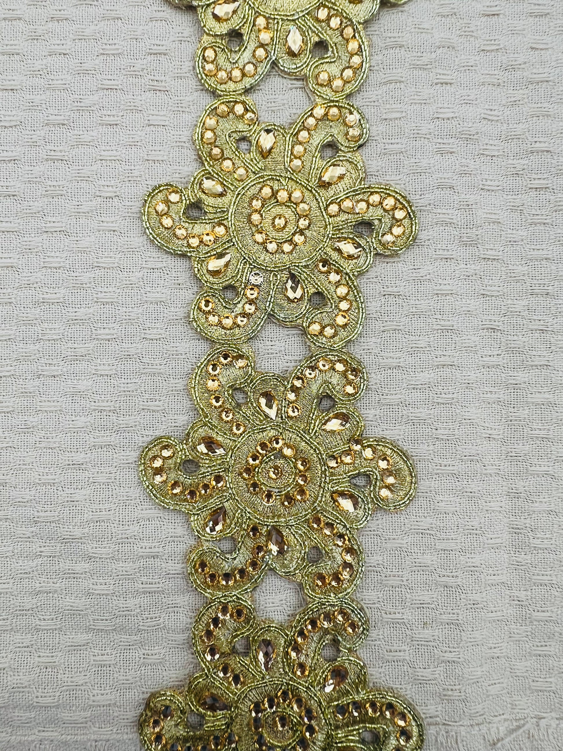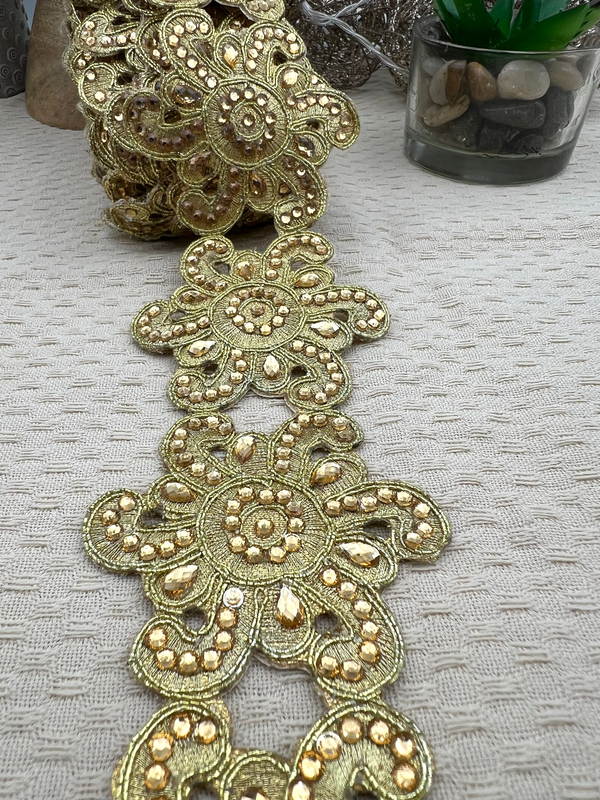 Ce galon oriental doré à grandes fleurs brodées séduit par son design imposant et son éclat somptueux. Ses motifs floraux minutieusement travaillés et ornés de perles et sequins dorés en font une pièce idéale pour rehausser vos créations les plus élégantes.