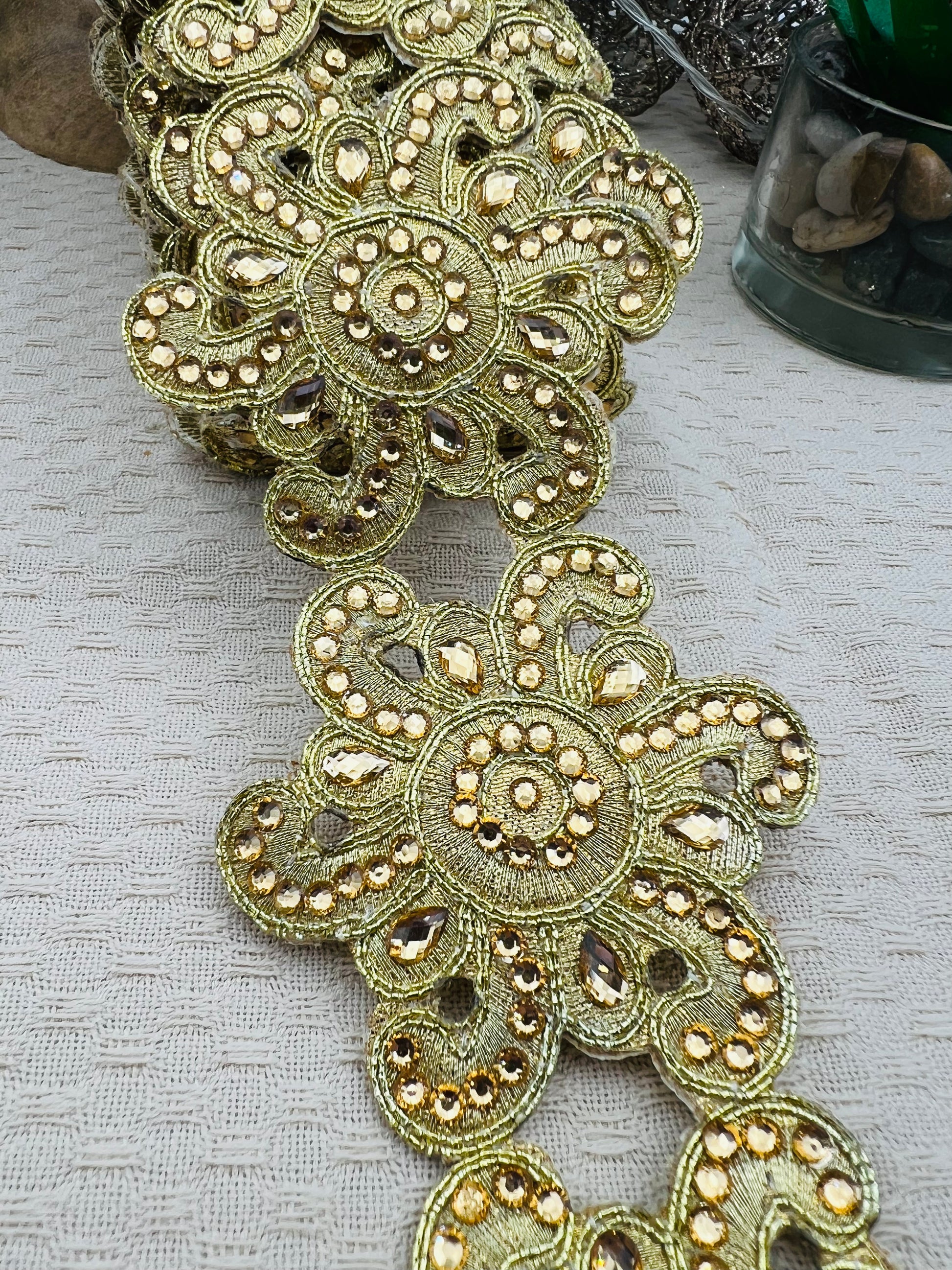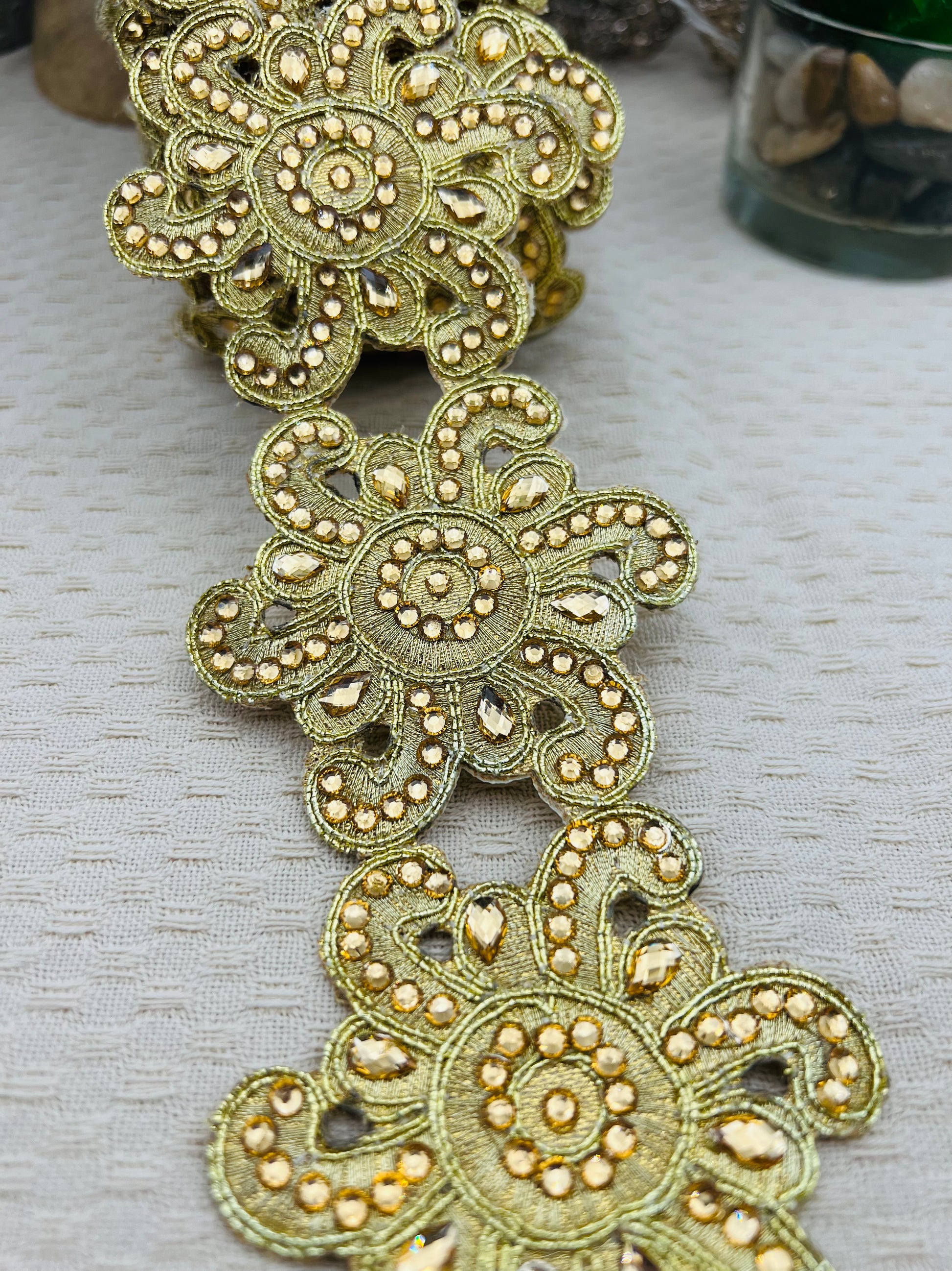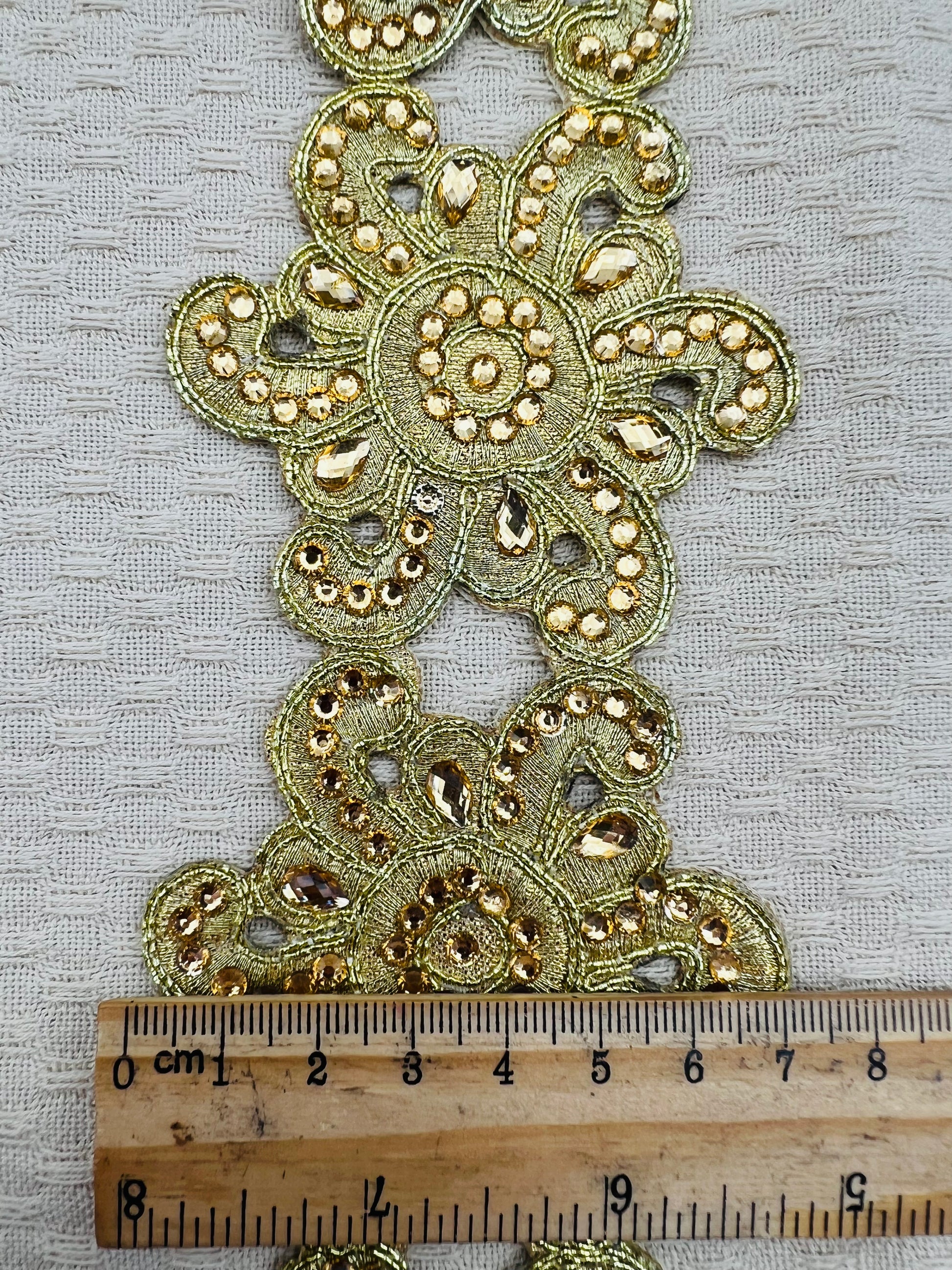 Ce galon oriental doré à grandes fleurs brodées séduit par son design imposant et son éclat somptueux. Ses motifs floraux minutieusement travaillés et ornés de perles et sequins dorés en font une pièce idéale pour rehausser vos créations les plus élégantes.