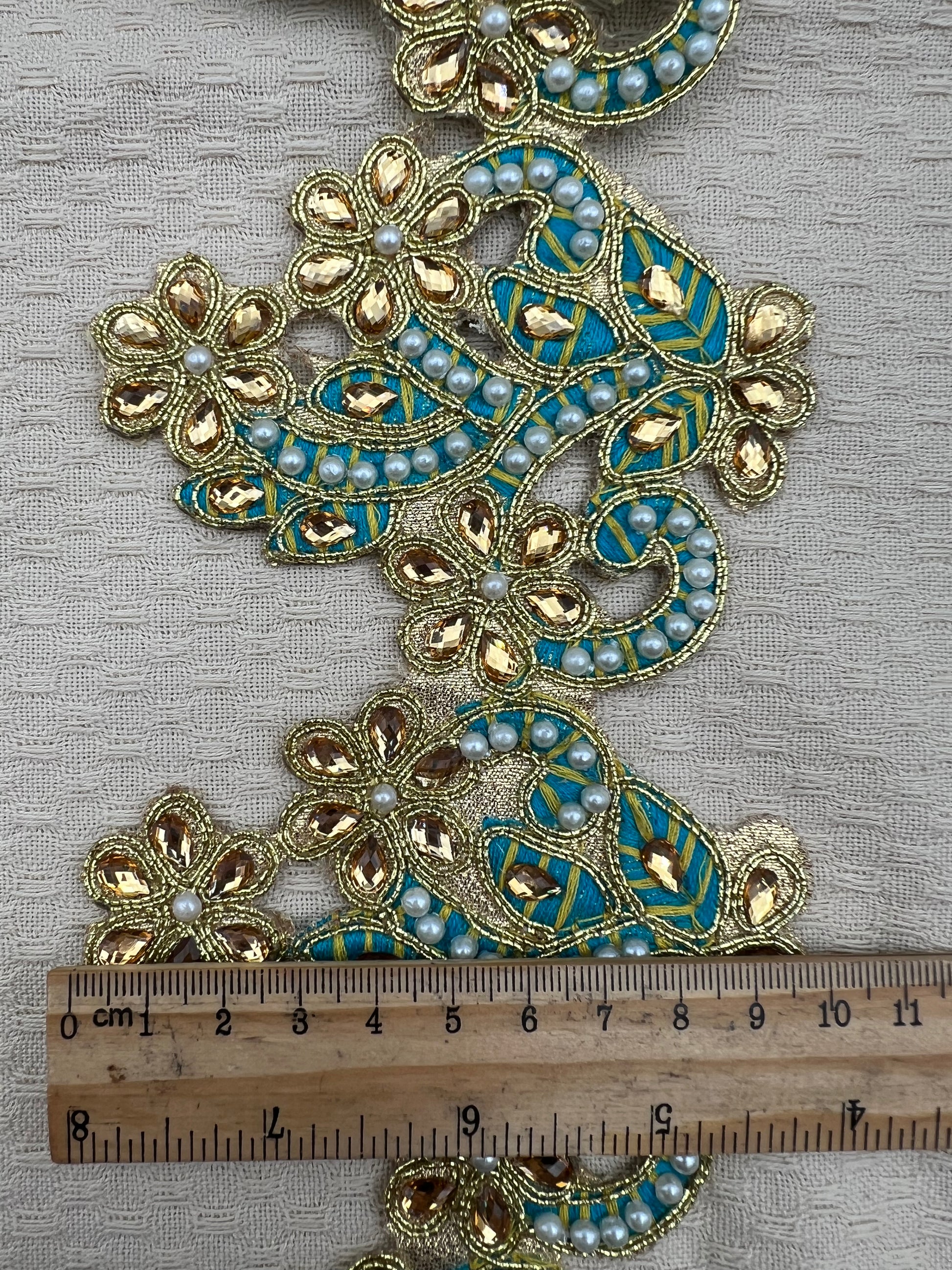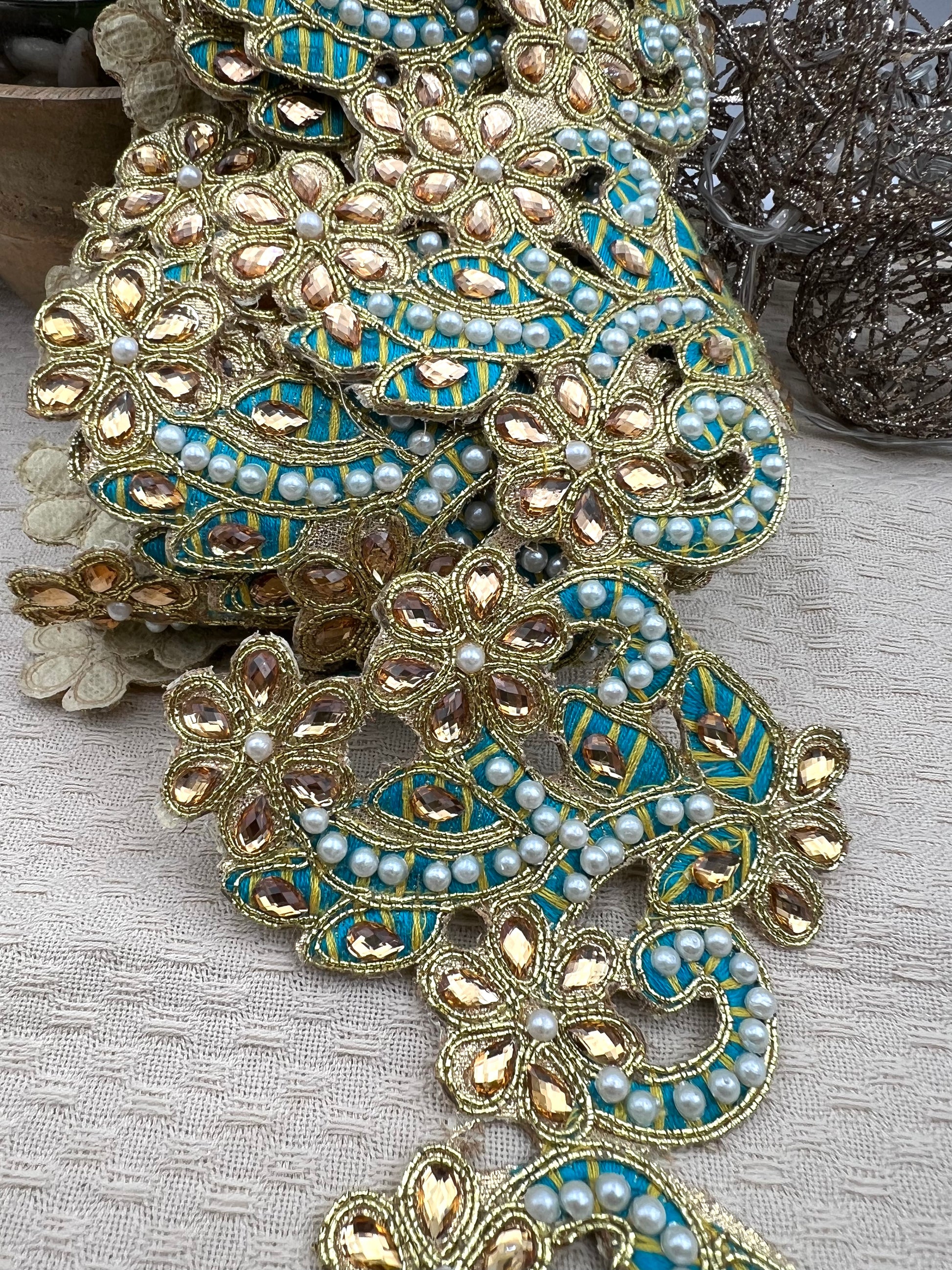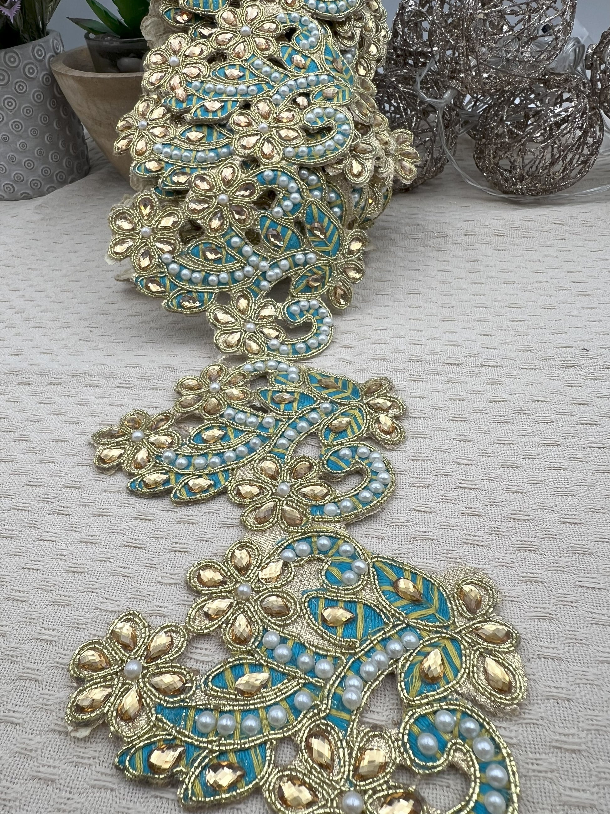 Ce galon oriental or et bleu à motifs floraux se distingue par ses détails raffinés et sa broderie luxueuse ornée de perles et sequins. Idéal pour apporter une touche d’élégance orientale à toutes vos créations textiles, il sublime aussi bien les vêtements traditionnels que les pièces modernes.