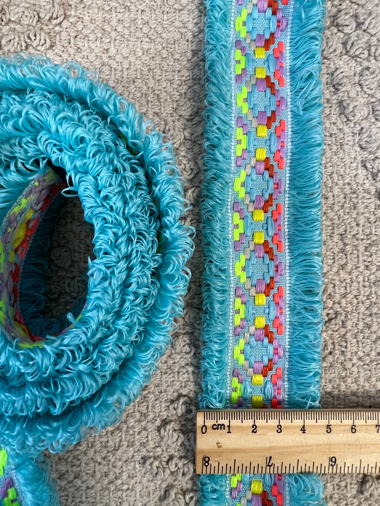 Galon tissé à franges fluo. Largeur 5 cm. Différents coloris. Quantité très limitée.