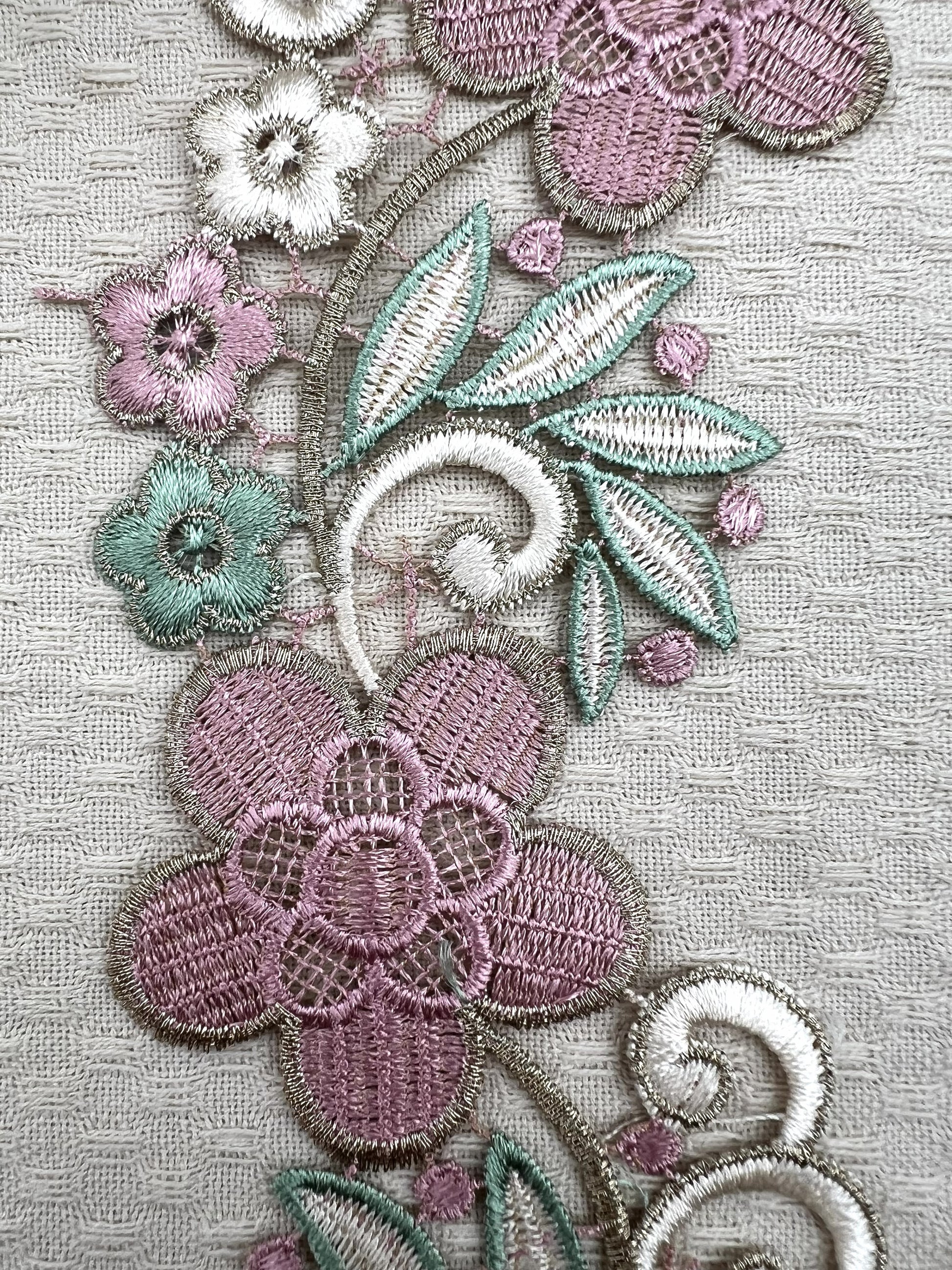 Guipure intemporelle fleurs rose vert doré. Largeur 7 à 8 cm. Différents coloris. Quantité très limitée.